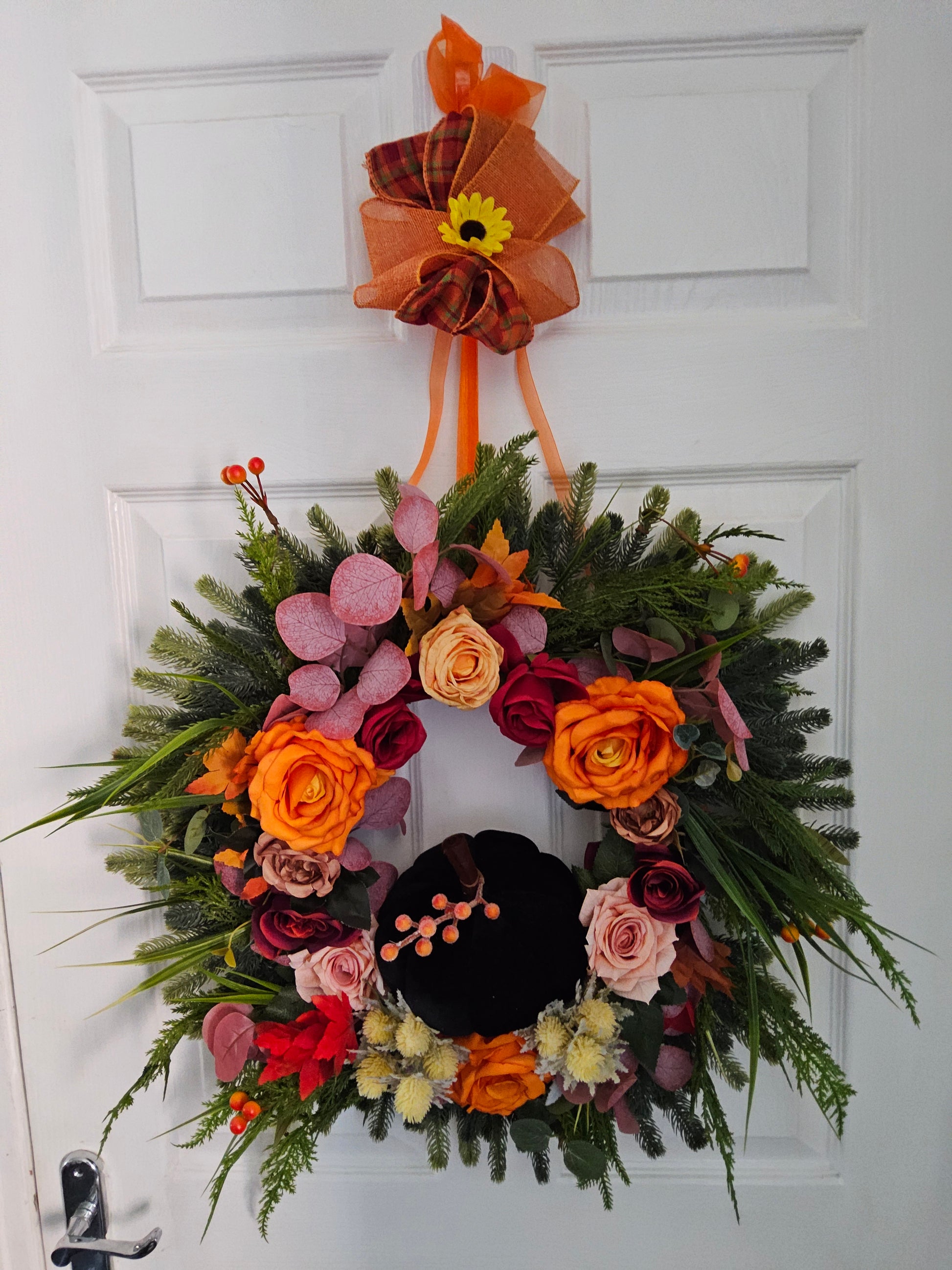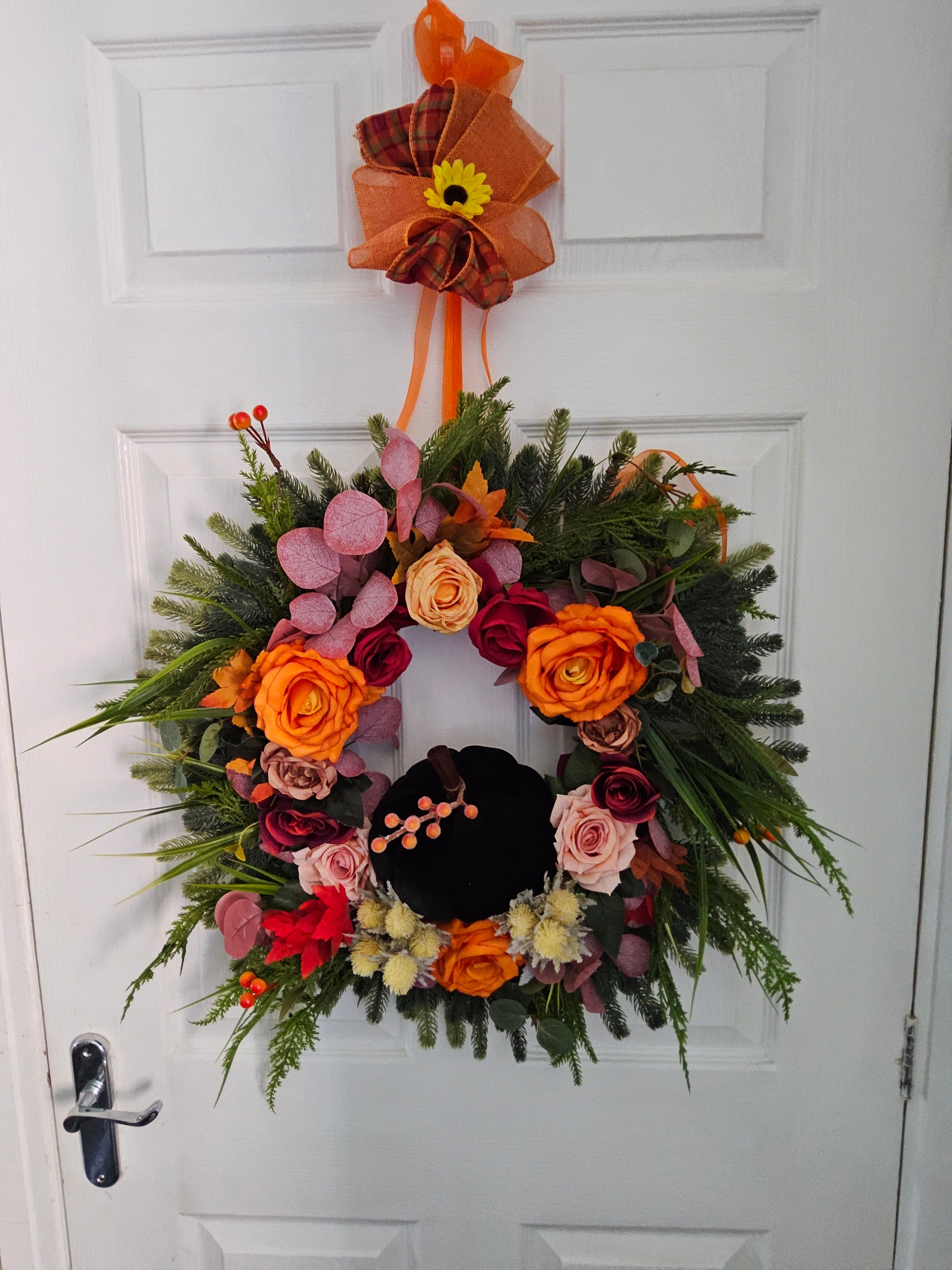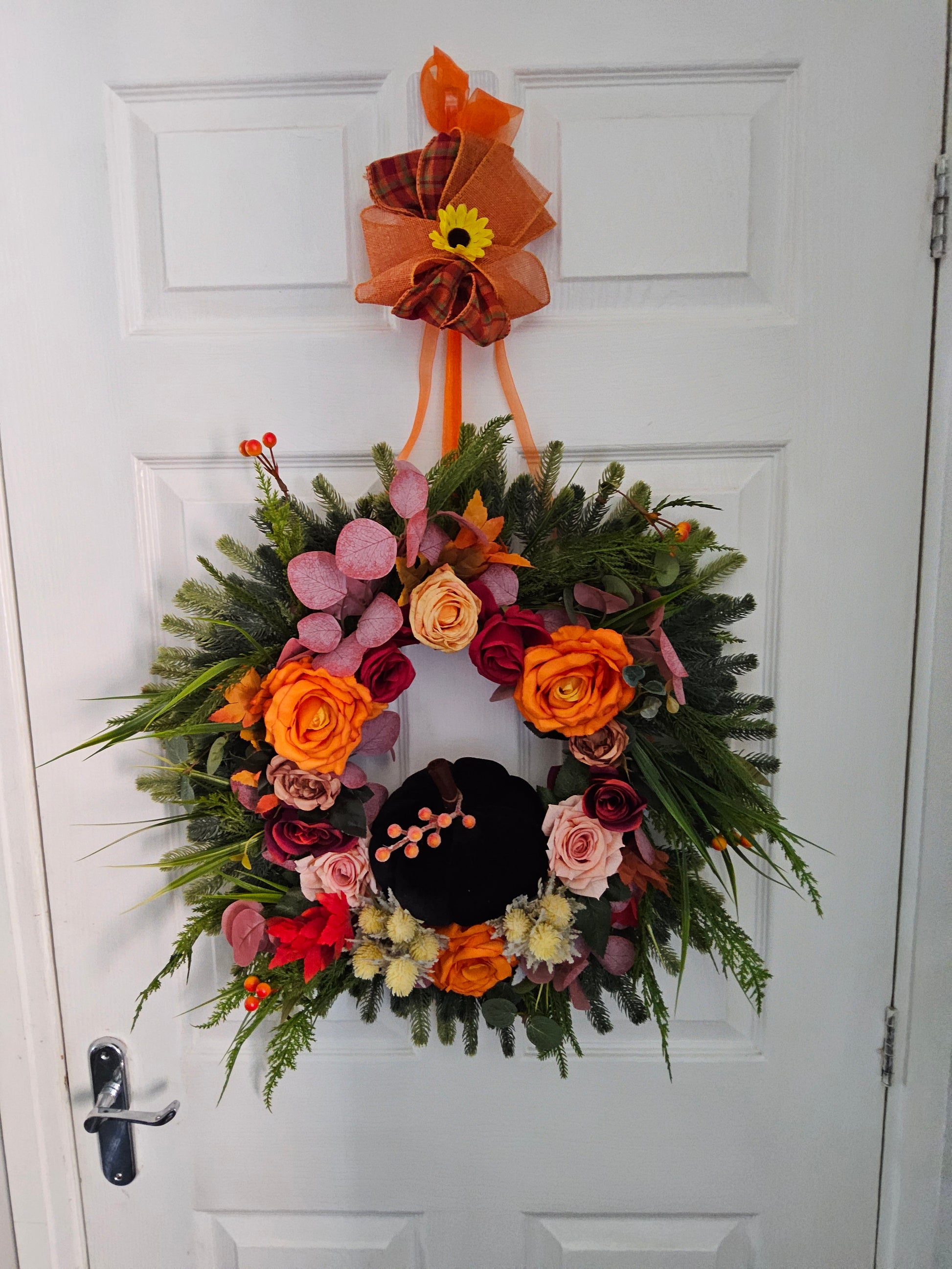 This handcrafted wreath combines the fresh feel of a woodland garden with the warm colours of autumn. A base of lush, faux evergreens and delicate ferns provides a vibrant backdrop for a beautiful assortment of roses in shades of burnt orange, blush pink, and deep red. A unique black pumpkin with subtle berry accents sits at the center, adding a modern and whimsical touch. The wreath is hung by a cheerful bow made of plaid and orange ribbons, making it a perfect, eye-catching addition to your seasonal decor.