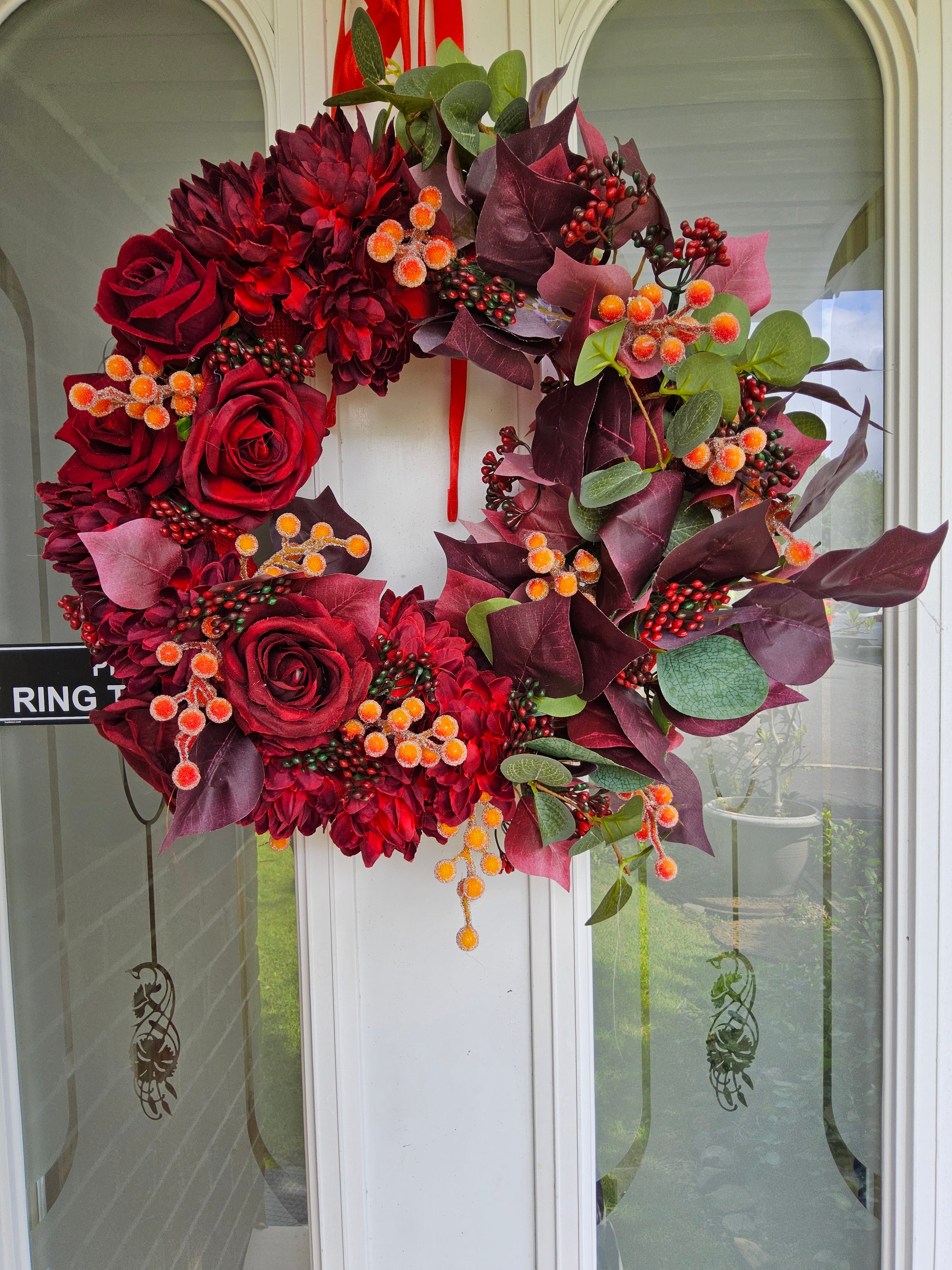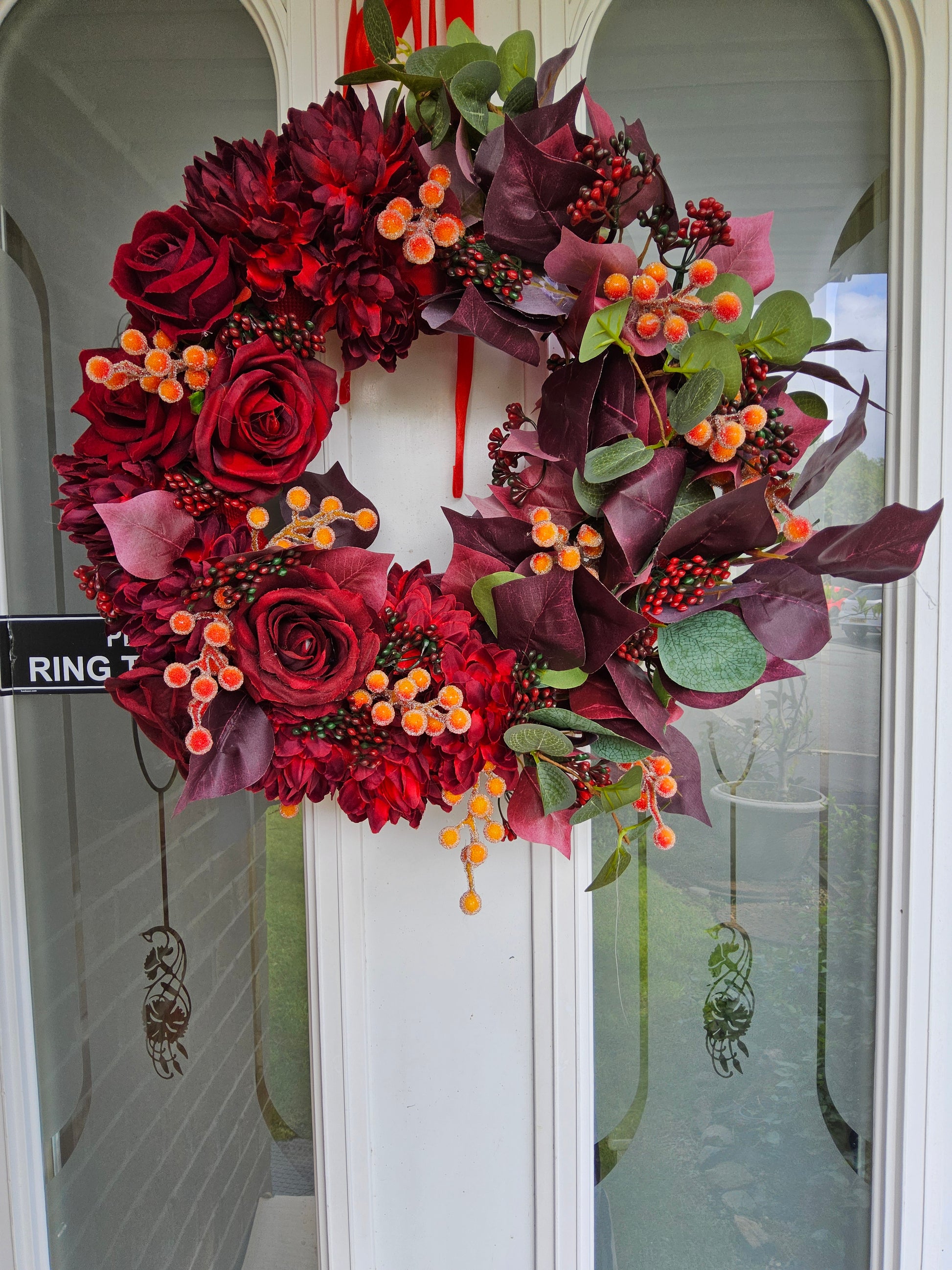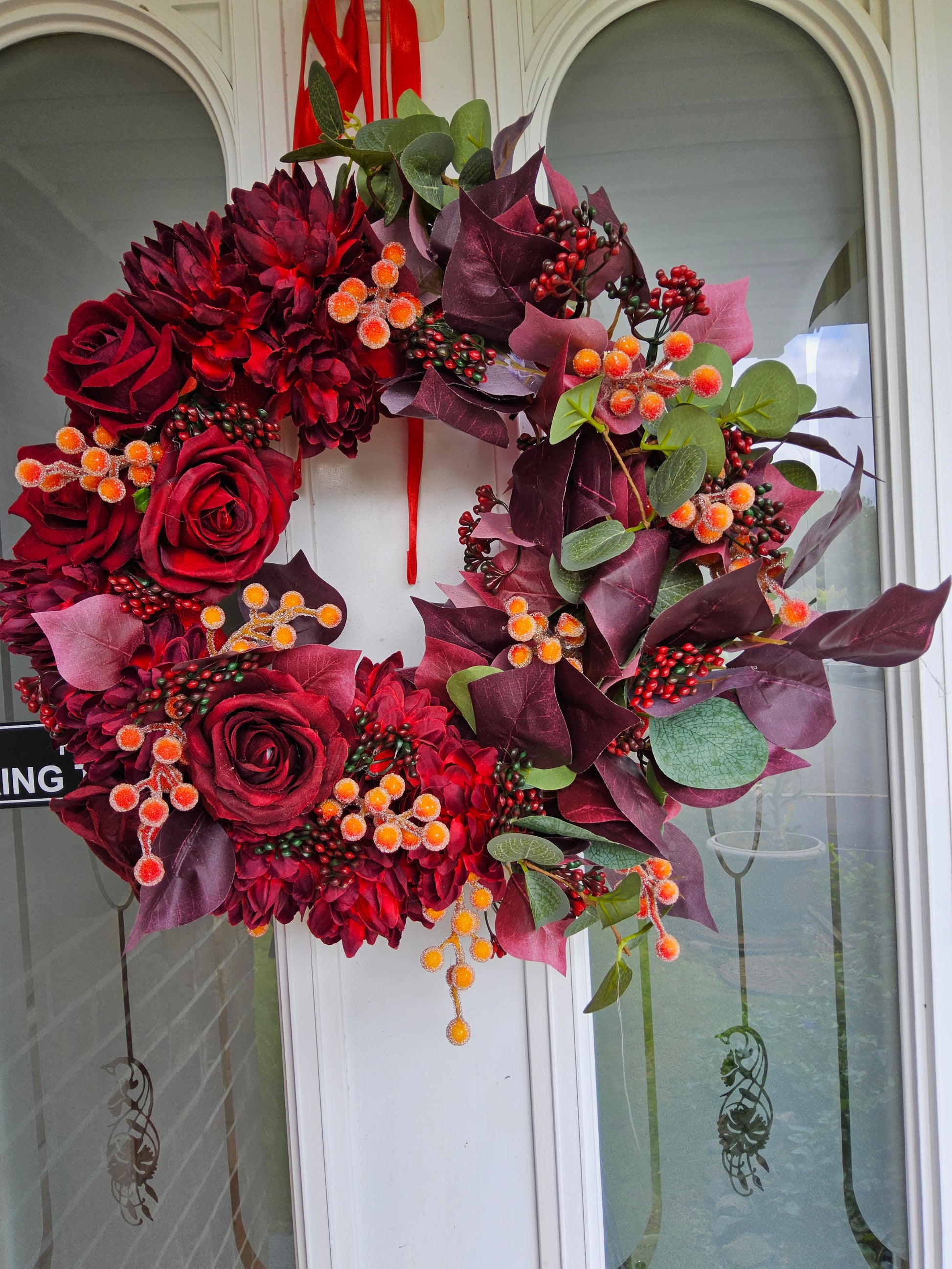 This rich and dramatic autumn wreath features a luxurious palette of deep burgundy and cranberry reds. The wreath is beautifully adorned with large, detailed faux flowers, including elegant roses and full dahlias, all in a deep red hue. These are complemented by striking foliage in shades of burgundy and deep purple, which provide a beautiful contrast. The arrangement is accented with vibrant clusters of berries—some in a deep red and others in a brighter, mottled orange—adding texture and a pop of colour. This sophisticated and opulent wreath would make a bold statement on any door, perfect for the late autumn and early winter seasons.