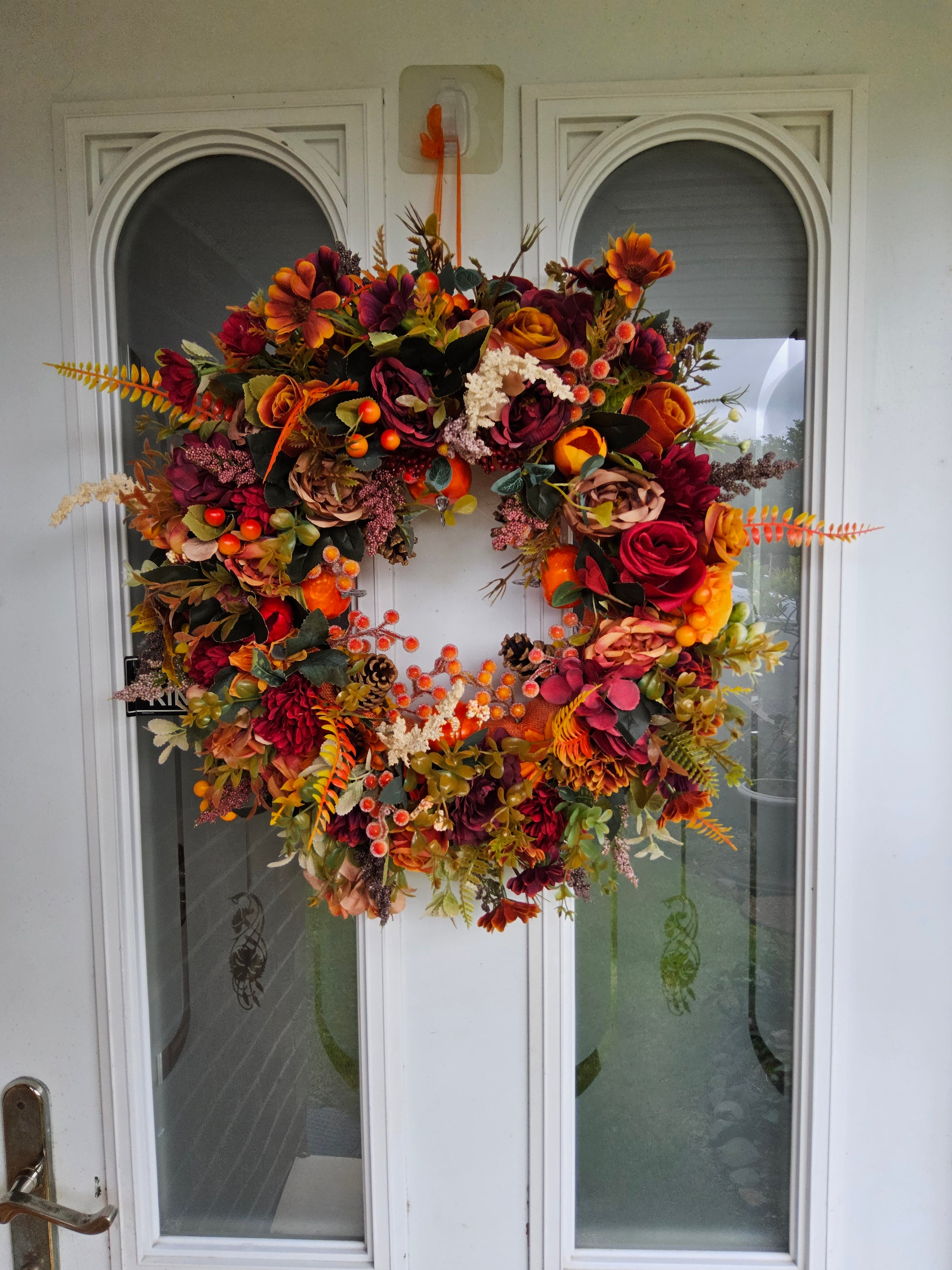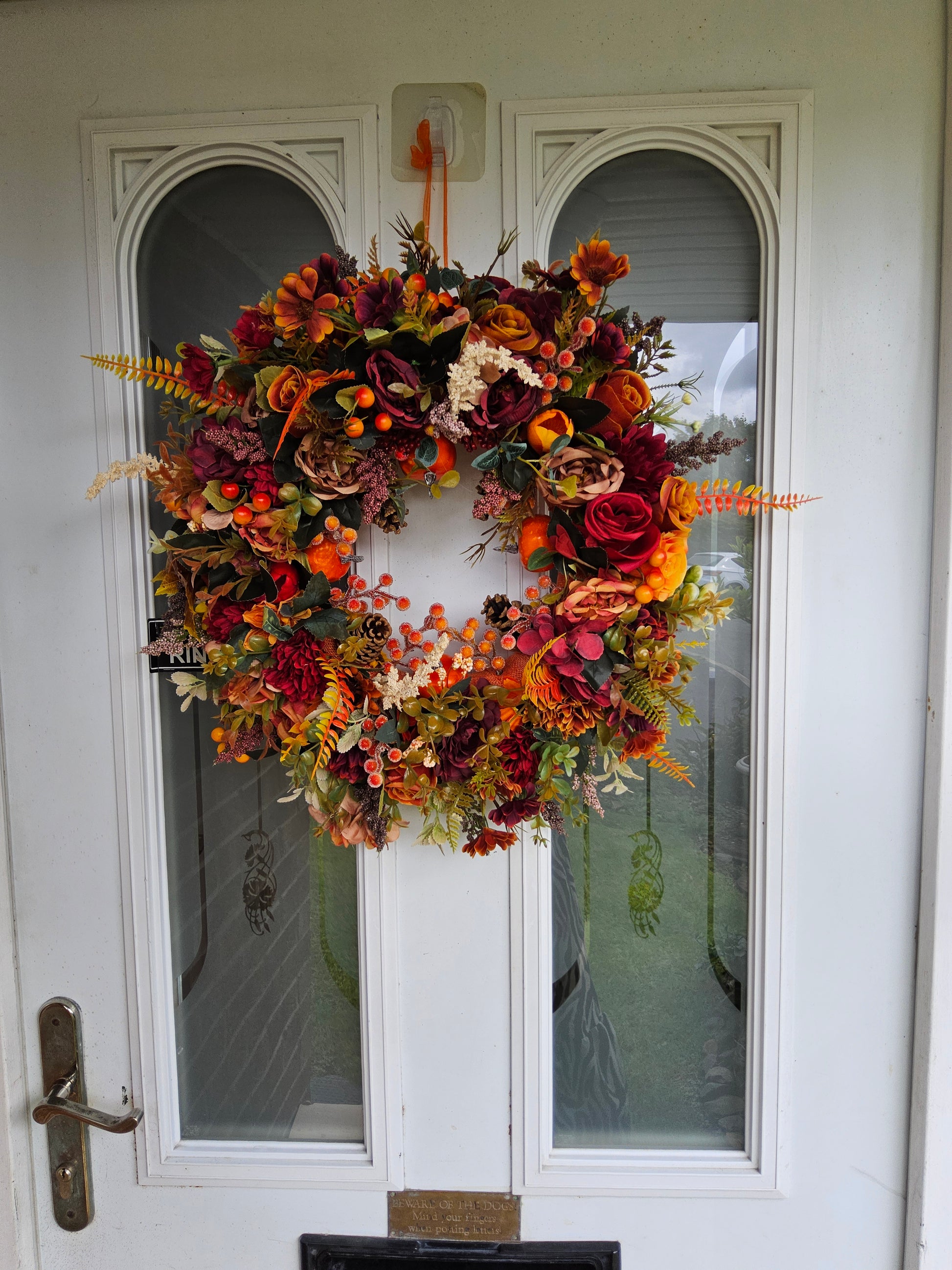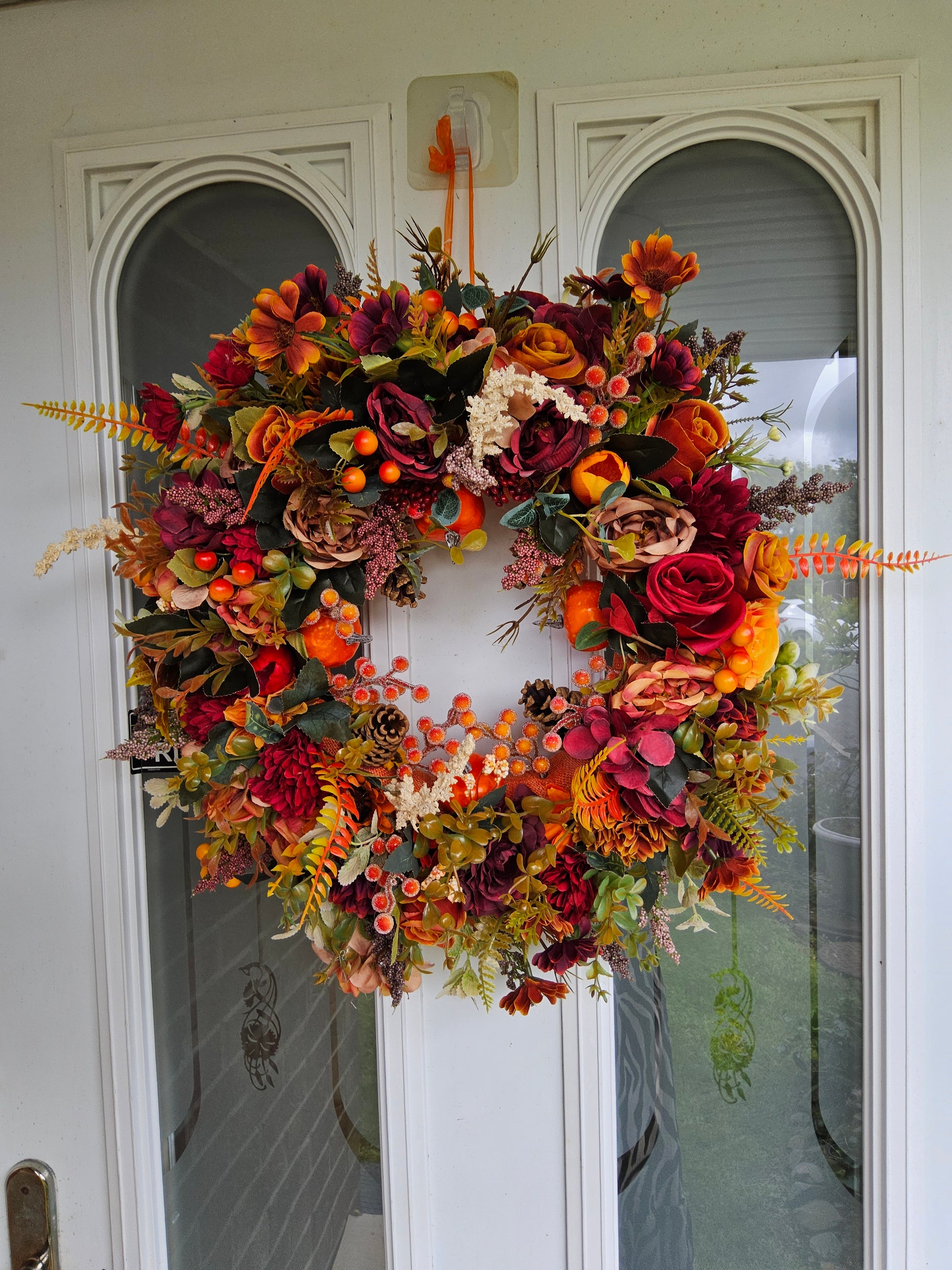 This beautiful autumn wreath is a vibrant celebration of the season's rich and warm colours. It features a lush mix of faux flowers, including deep red roses, golden-orange blooms, and burgundy peonies. The arrangement is accented with realistic-looking berries, small pinecones, and wispy greenery in various shades of orange, yellow, and green, creating a full and textured display. Perfect for hanging on a front door to welcome guests with a touch of seasonal charm, this wreath captures the essence of a bountiful autumn harvest.