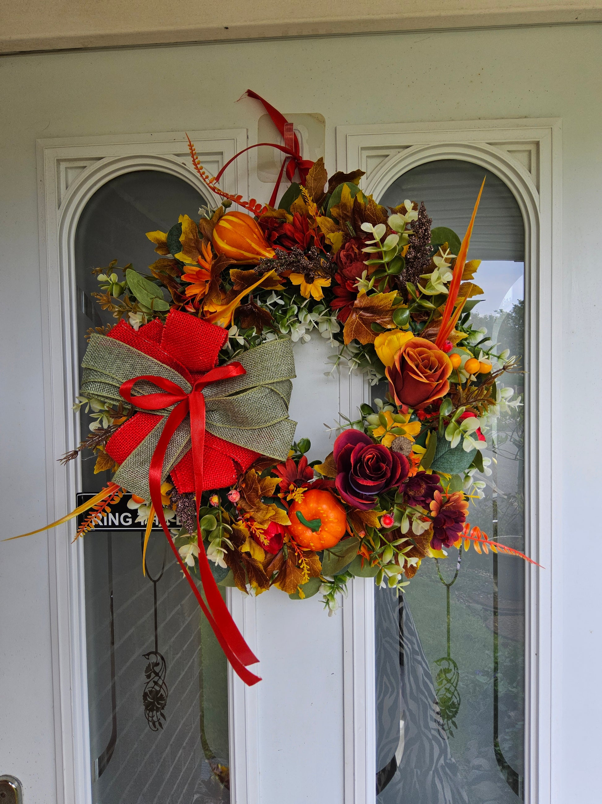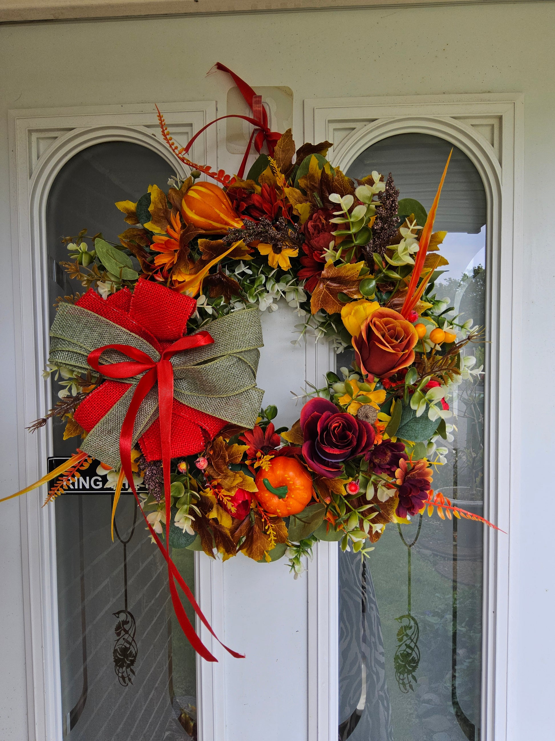 Description: This handcrafted wreath is a stunning celebration of autumn's vibrant colours. A lush arrangement of faux leaves in deep crimson, fiery orange, and golden yellow forms a beautiful backdrop for rich red and purple floral accents. The wreath is finished with a striking, layered bow of red satin and rustic olive-green burlap, making it a perfect statement piece to adorn your door throughout the autumn season.