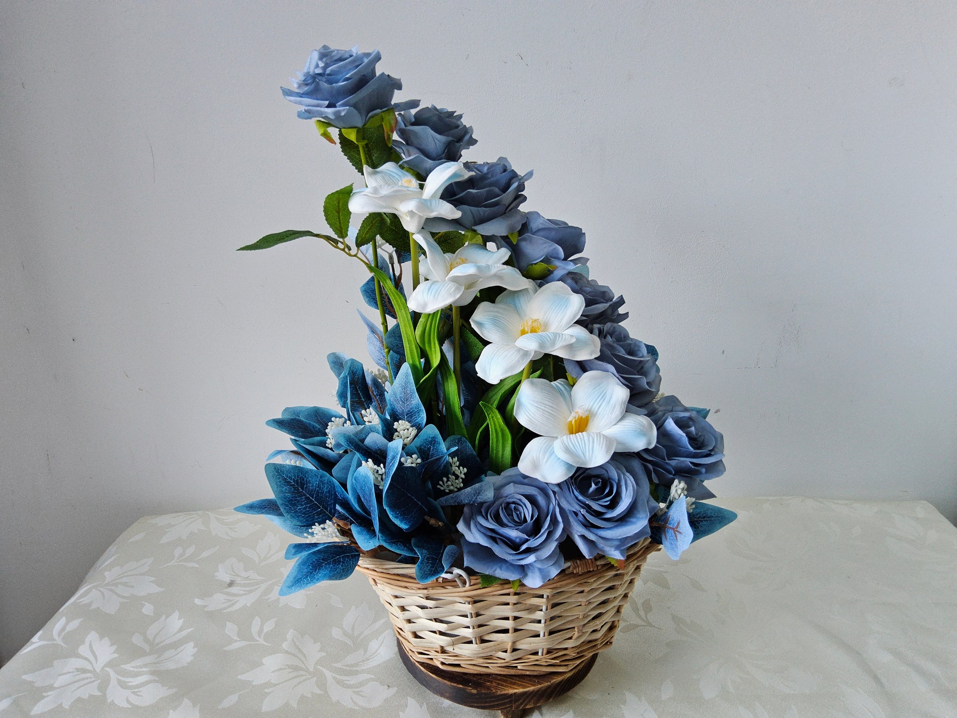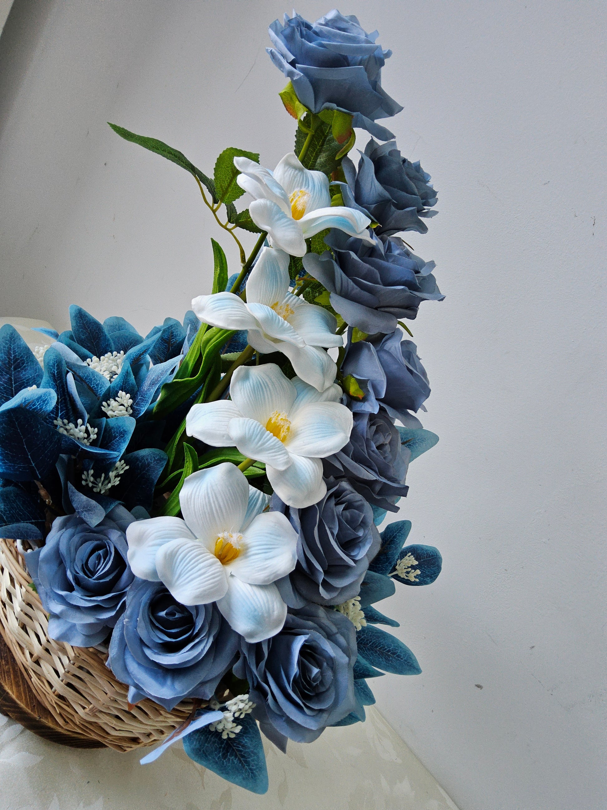 Bring timeless elegance into your home with Azure Dream. Featuring stunning blue roses, the palest blue lilies, and graceful blue eucalyptus leaves, all arranged in a beautifully woven basket, this faux floral display offers effortless style and lasting charm. Perfect for brightening any space without upkeep, Azure Dream is the ideal choice to enhance your décor with a touch of serene beauty.