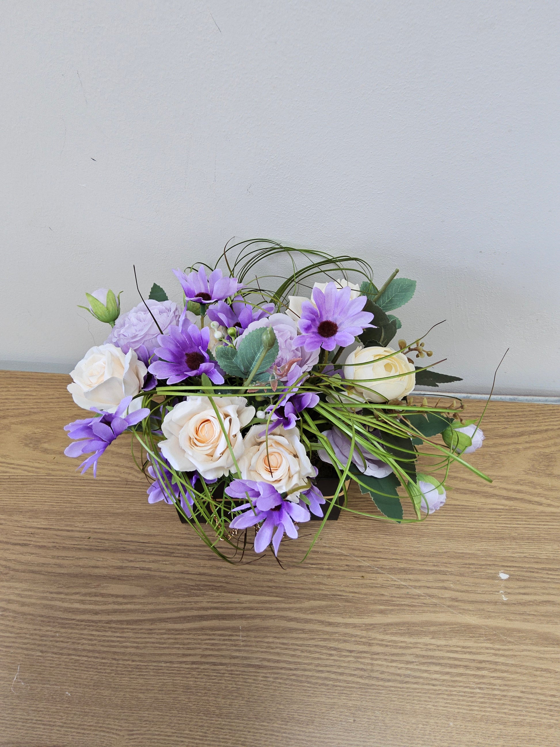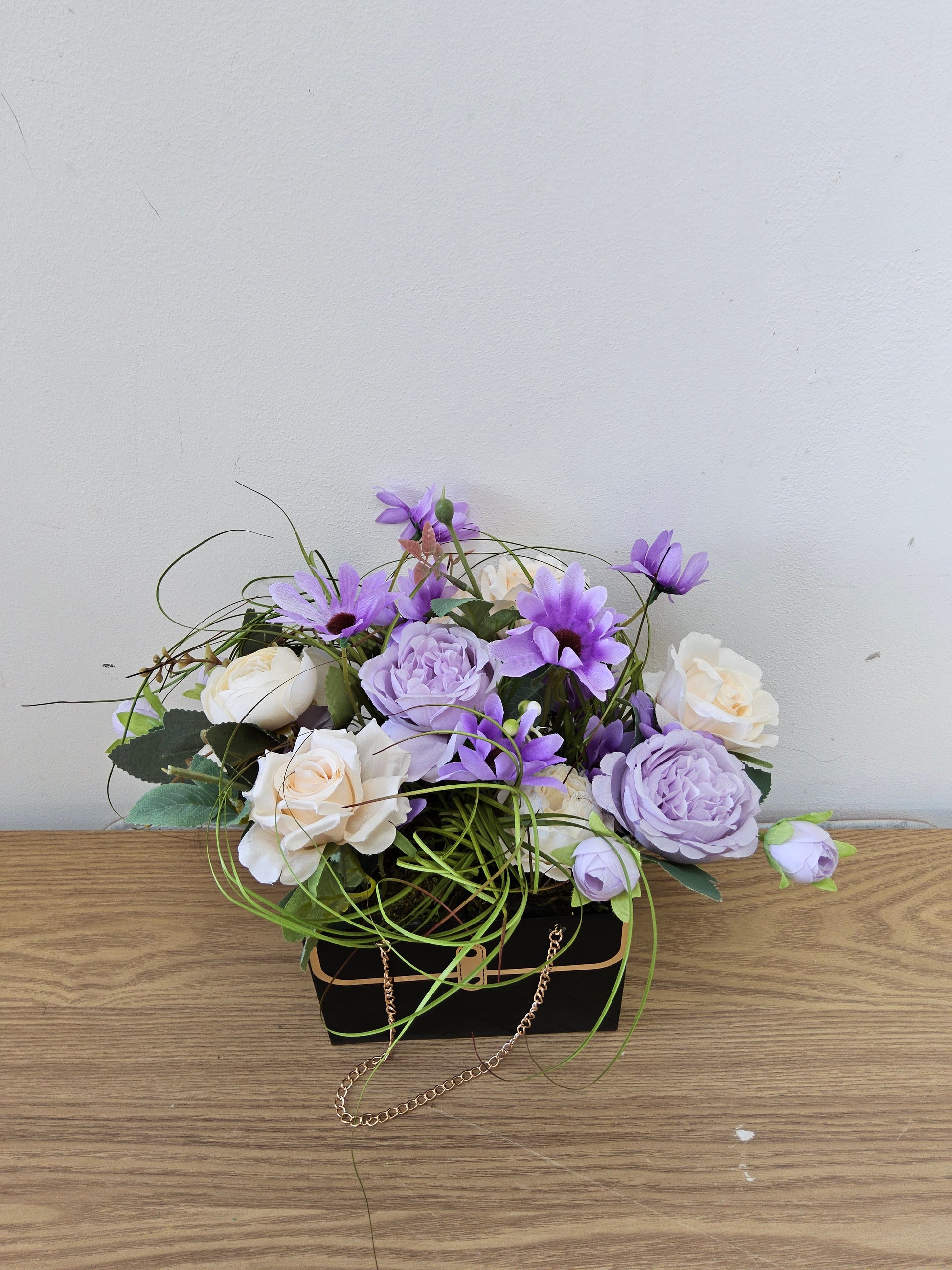 This elegant and stylish faux floral arrangement is presented in a unique black container designed to resemble a handbag, complete with a delicate gold chain detail. The bouquet is a beautiful mix of creamy off-white roses and soft lavender and purple blossoms, including star-shaped flowers and full, multi-petaled blooms. Wispy blades of grass and curly green wire are artfully intertwined throughout the arrangement, creating a modern and dynamic texture. This sophisticated piece combines a classic color palette with a contemporary presentation, making it a perfect decorative accent for a fashionable home or office.
