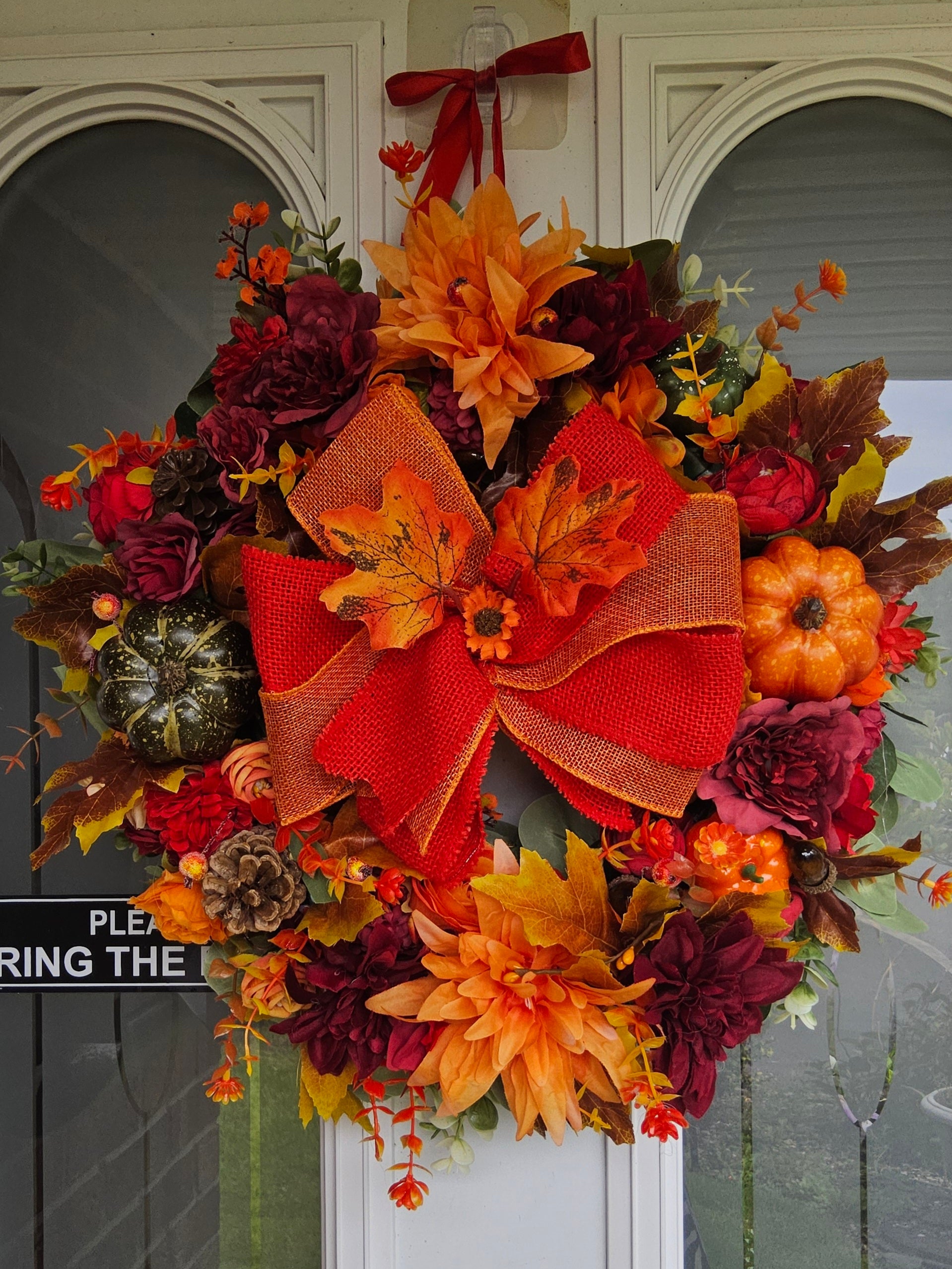 Embrace the beauty of the Autumn season with this stunning handcrafted Autumn wreath. A rich tapestry of seasonal colours, the wreath features lush dahlias, peonies, and berry clusters in shades of deep burgundy, burnt orange, and golden yellow. The centerpiece is a magnificent, wired. burlap bow in a vibrant orange, adorned with maple leaves. Charming accents of small pumpkins, gourds, and natural pinecones are nestled among the foliage , creating a warm welcoming display for your front door