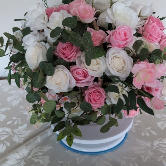 This is a luxury large faux pink and white delicate, beautiful silk floral arrangement full of different roses and peonies in a wooden basket.