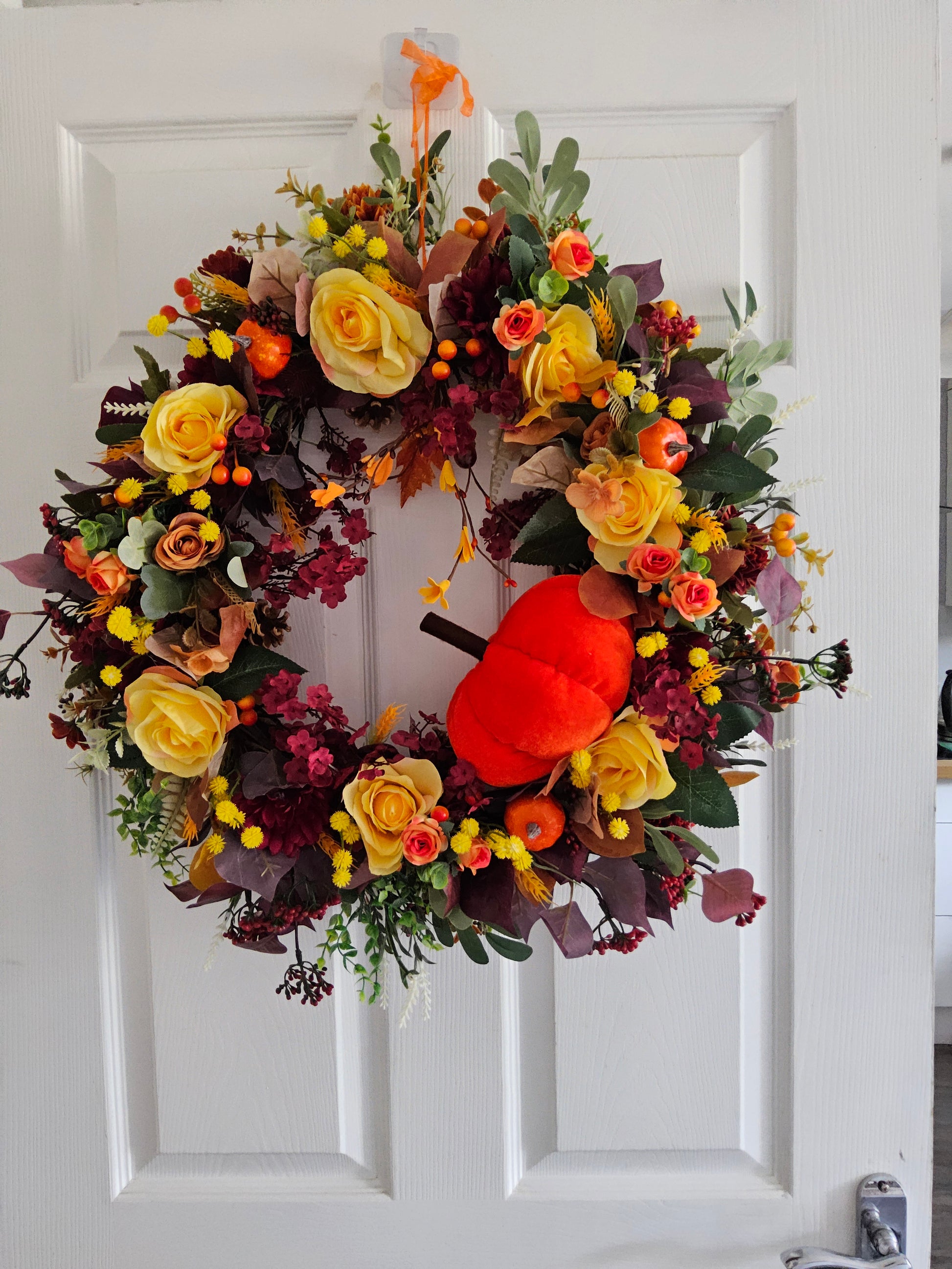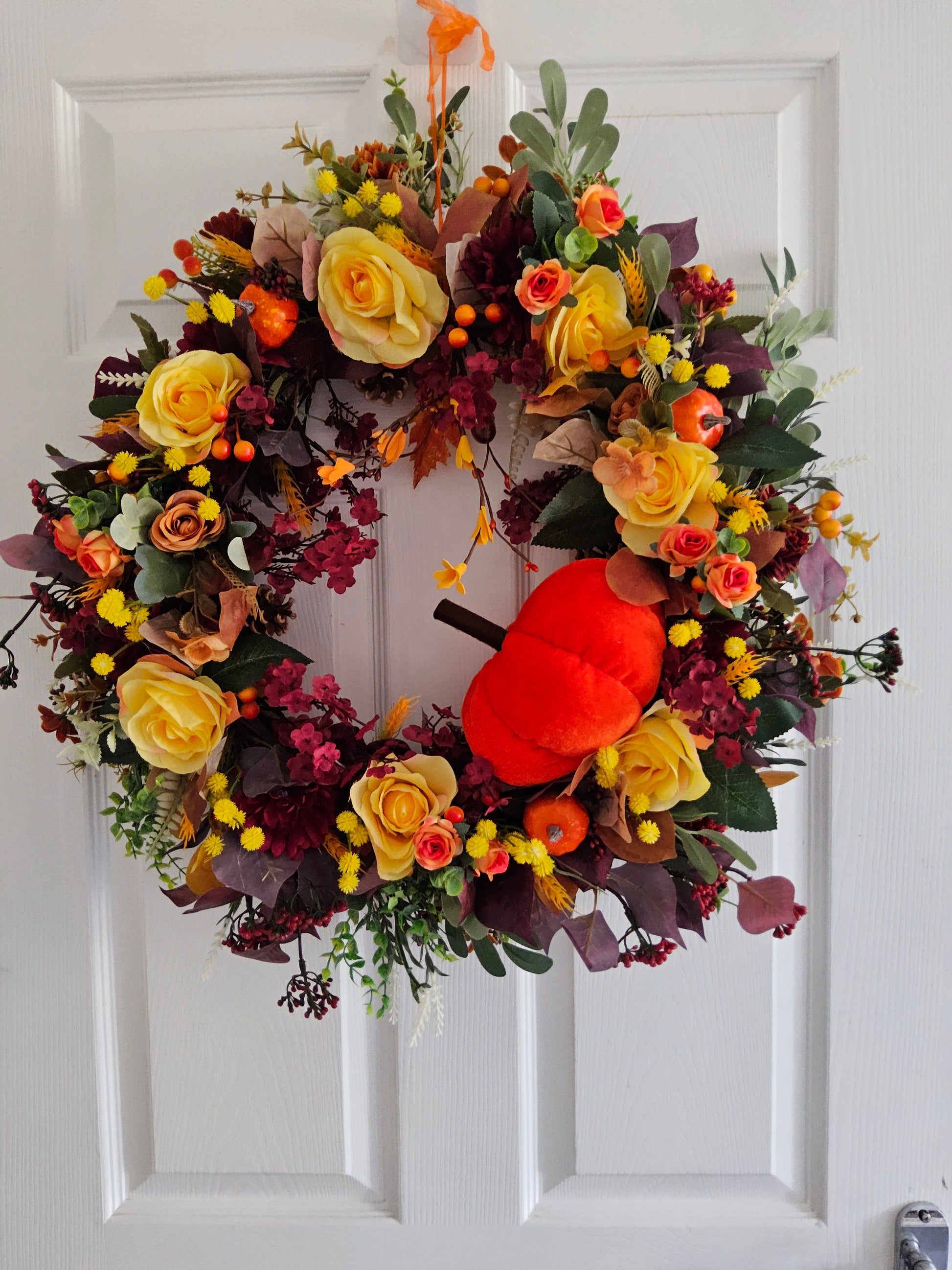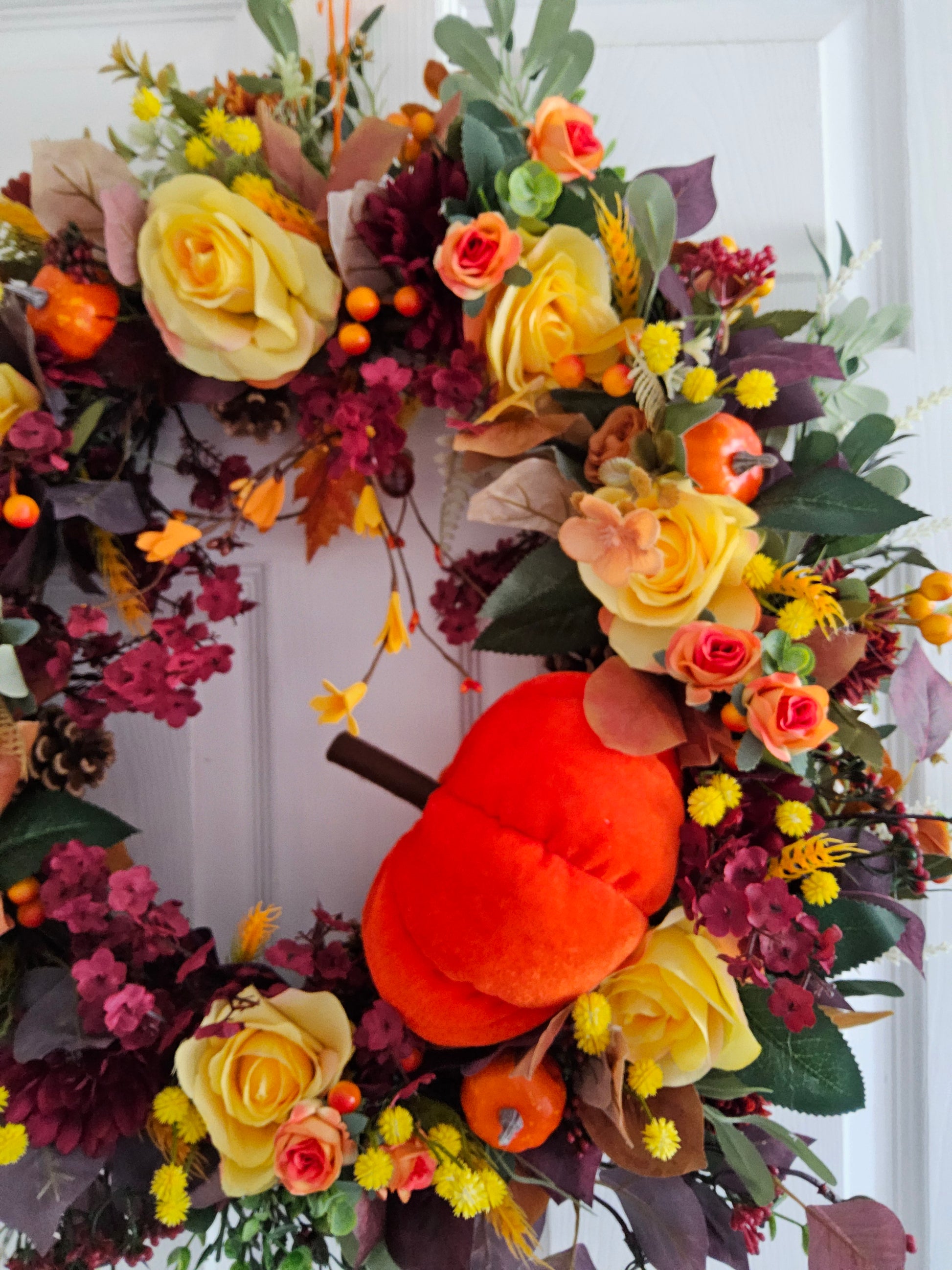 Description: This festive, handmade wreath is a beautiful tribute to the warm and inviting colors of the harvest season. A prominent plush orange pumpkin takes center stage, surrounded by a stunning mix of large, creamy yellow roses and smaller burnt orange blooms. The arrangement is enhanced with rich burgundy leaves, delicate berries, and rustic pinecones, creating a full and textured design perfect for welcoming guests to your home this autumn.
