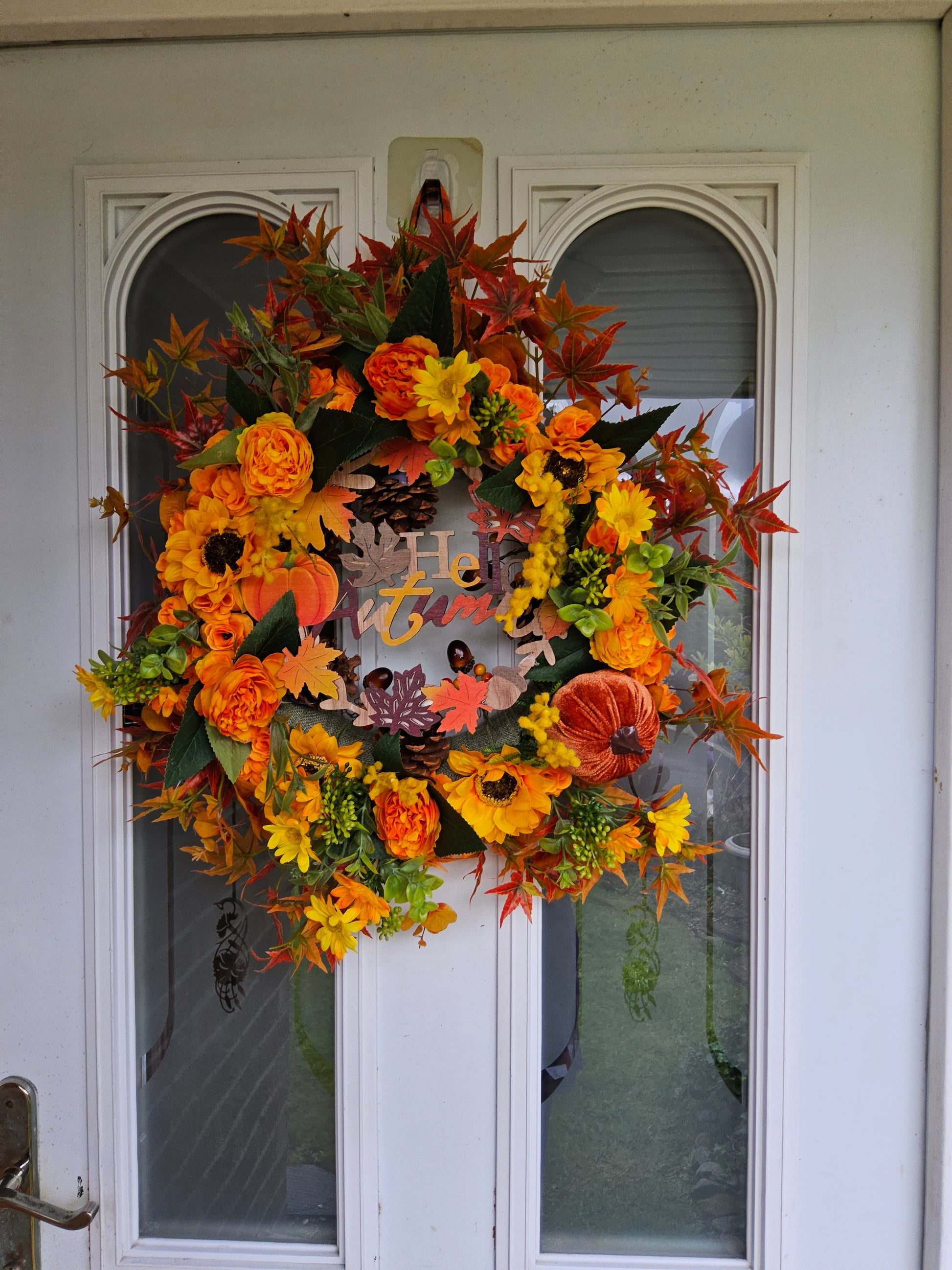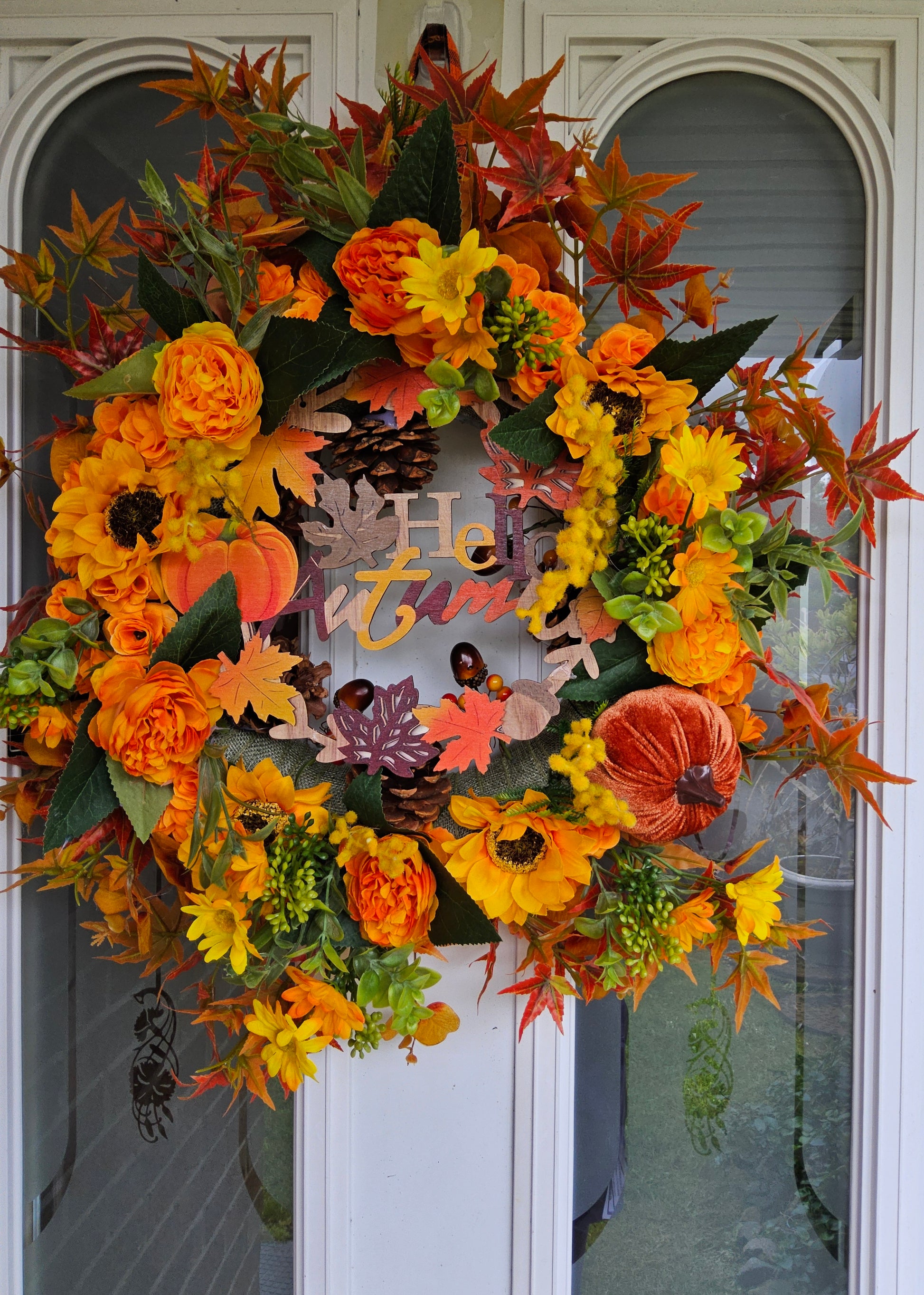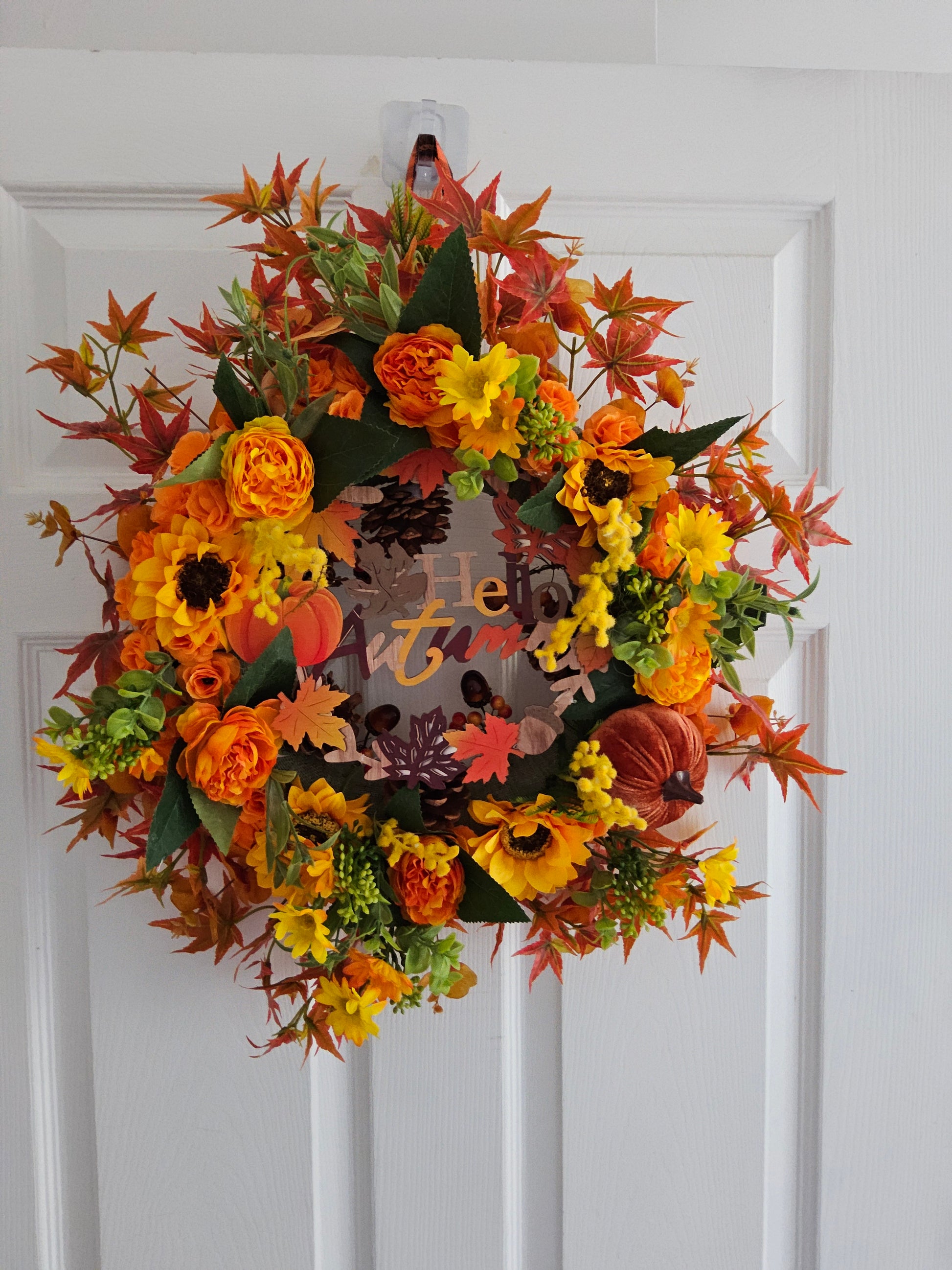 This vibrant wreath is a celebration of the autumn season, bursting with warm shades of orange, yellow, and green. The centerpiece is a collection of bright sunflowers, dahlias, and other golden-hued blossoms, complemented by a mix of detailed maple leaves and other foliage. Tucked among the flowers are charming autumn accents like small pumpkins, pinecones, and a wooden sign that reads "Hello Autumn," creating a welcoming and festive feel.