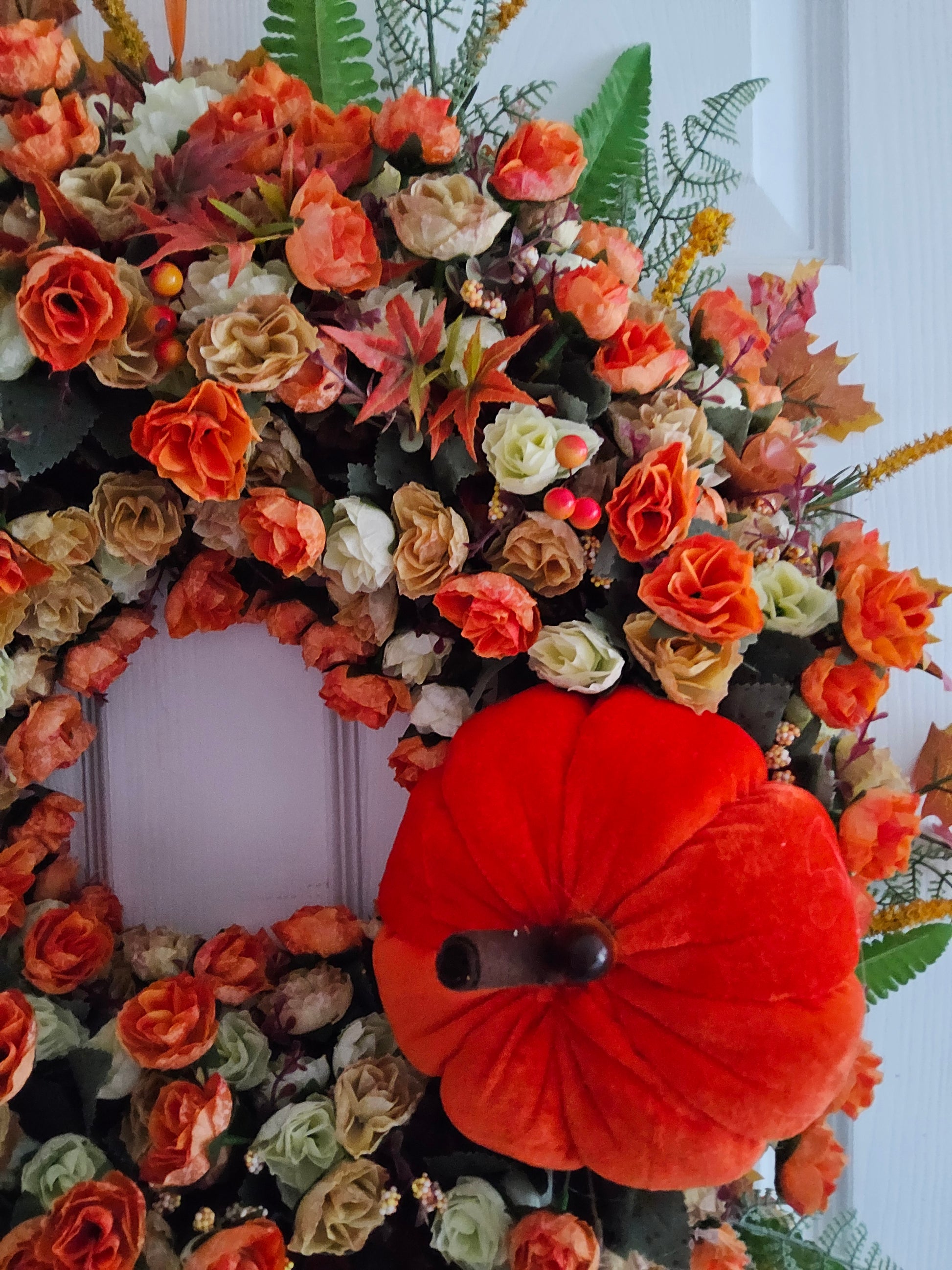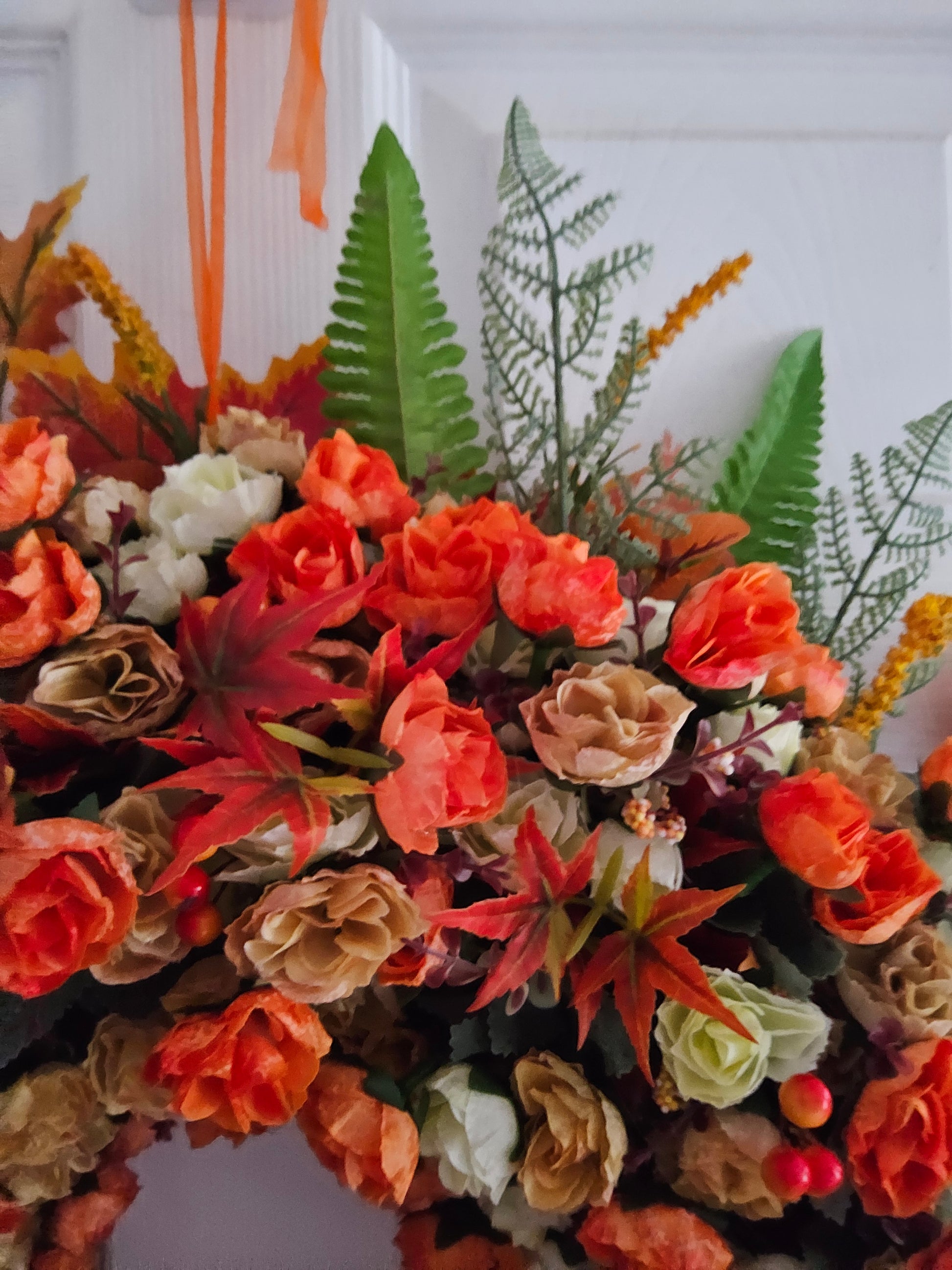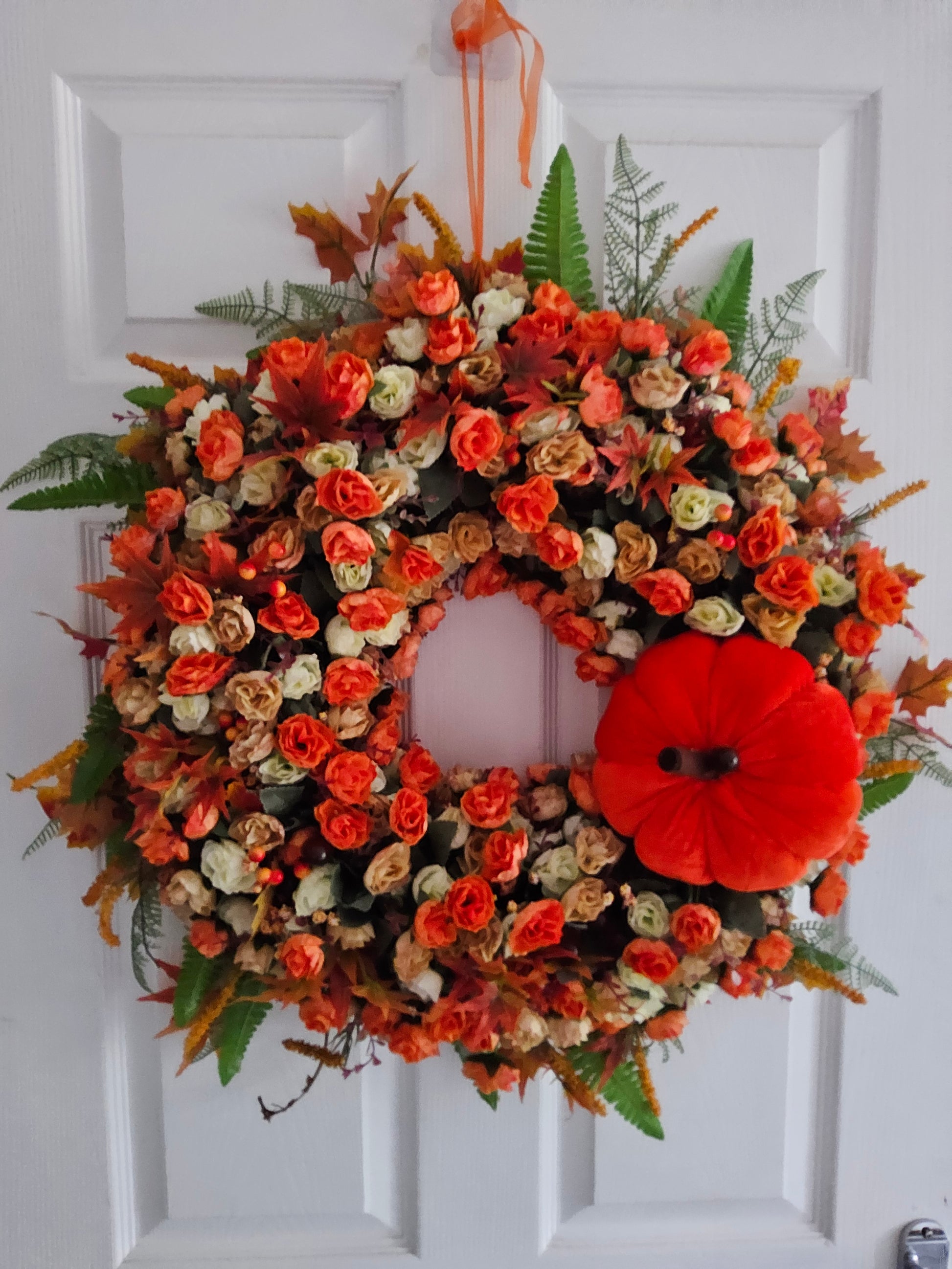 This is a beautiful and dense homemade wreath, overflowing with a hundred or more small artificial flowers. The flowers are arranged in a warm autumnal colour palette, featuring various shades of orange, cream, and a hint of dusty pink. The vibrant floral cluster is complemented by a faux maple leaves in burnt orange and some delicate green fern fronds that give the piece a natural, lush feel. A striking, soft fabric pumpkin in a bold orange hue is nestled on the right side, serving as a charming focal point. The wreath is tied with an orange ribbon for hanging and is waterproof sprayed. This wreath is a perfect decorative piece to celebrate the autumn season.
