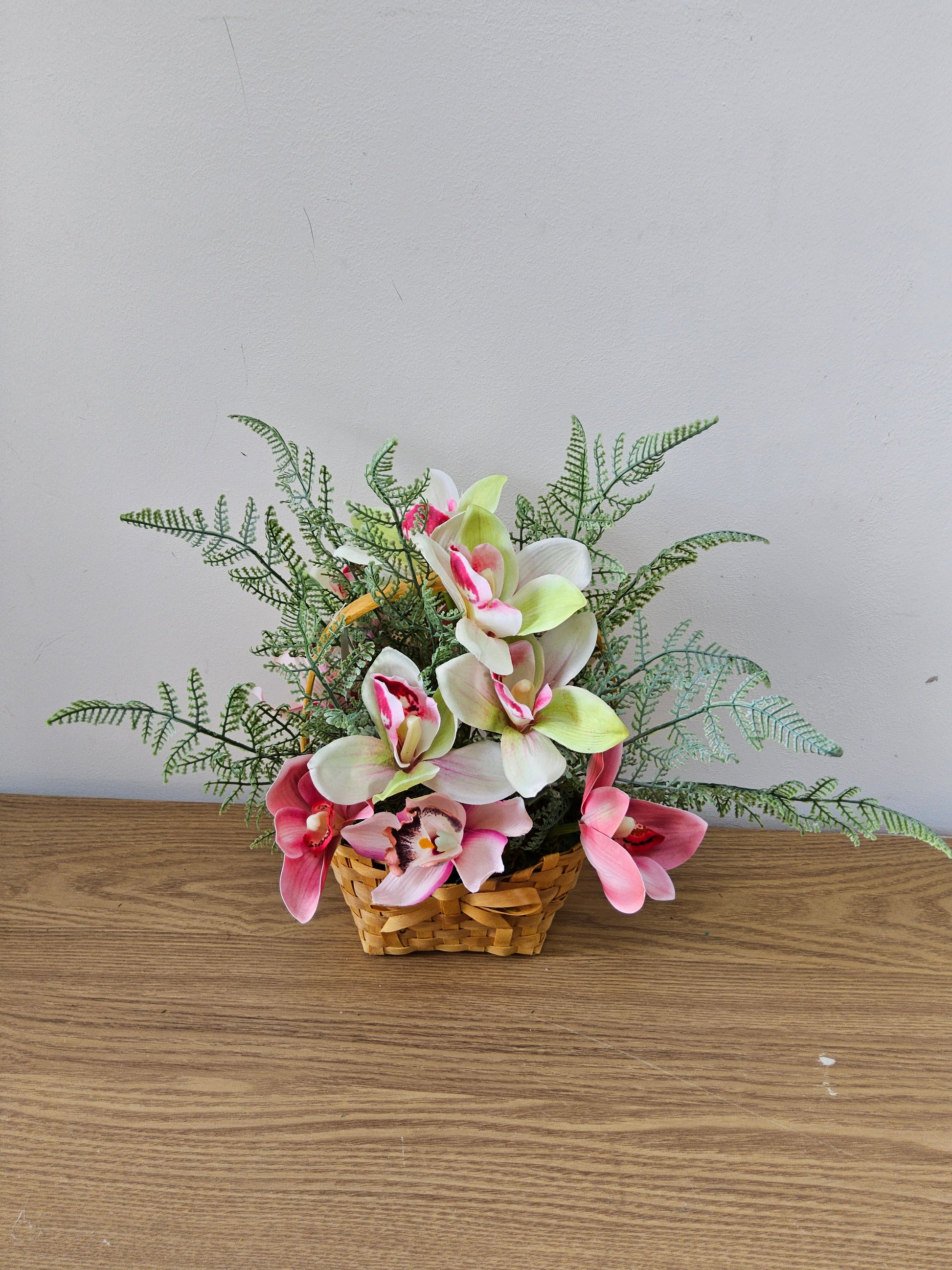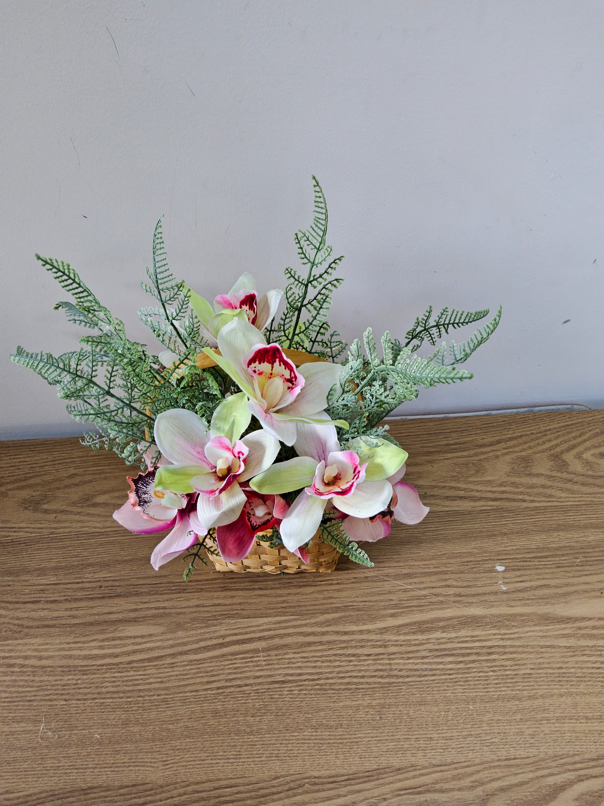 This charming faux floral arrangement brings a touch of tropical elegance to any setting. Nestled in a small, woven basket, it features a cluster of realistic orchid blossoms. The flowers showcase a delicate blend of creamy white, pale green, and soft pink hues, accented by a deep burgundy center. They are beautifully complemented by feathery, light green fern fronds that fan out around the blooms, creating a lush and naturalistic look. This compact and stylish arrangement is perfect for adding a pop of color and an exotic feel to a desk, side table, or shelf.