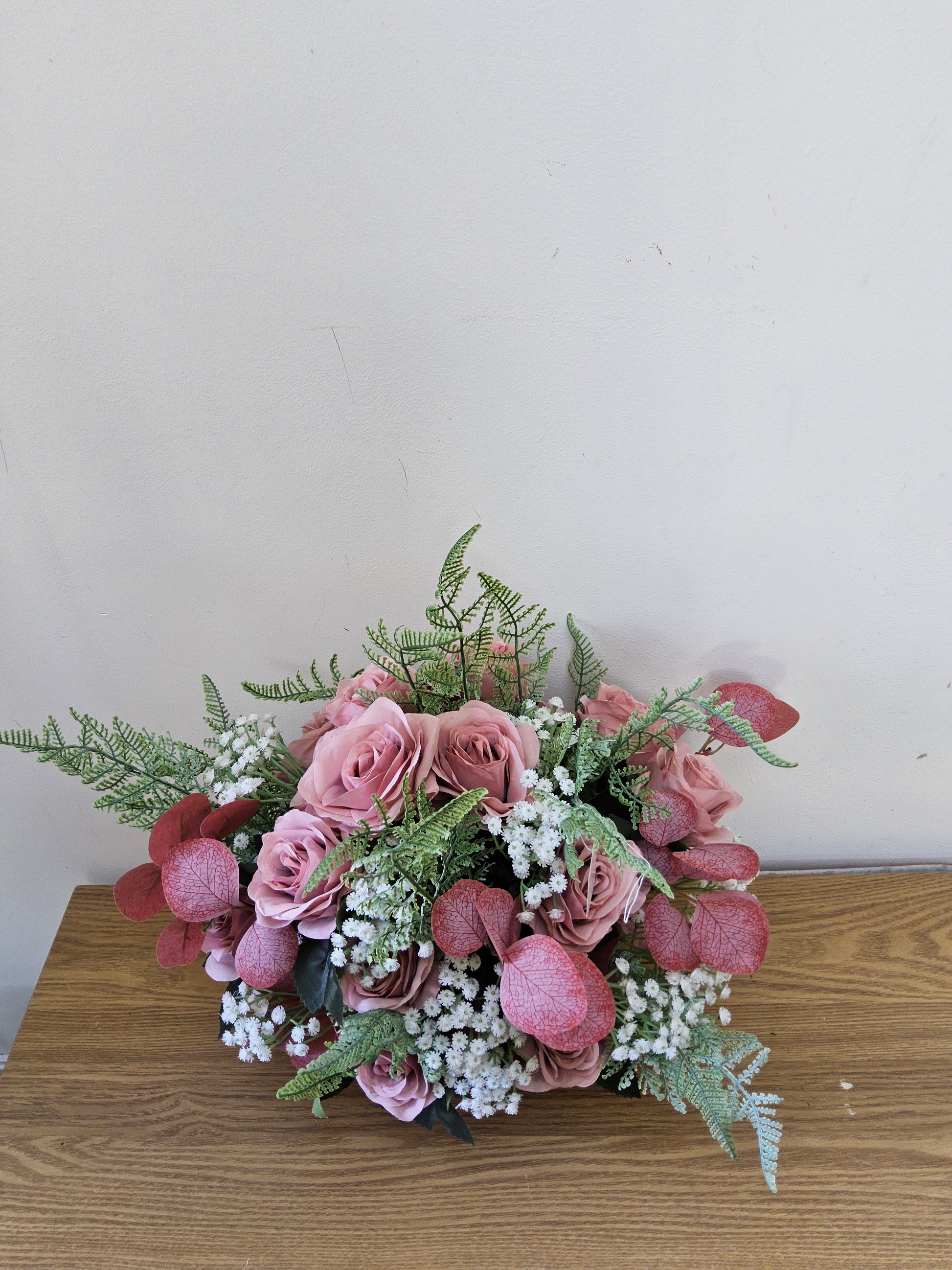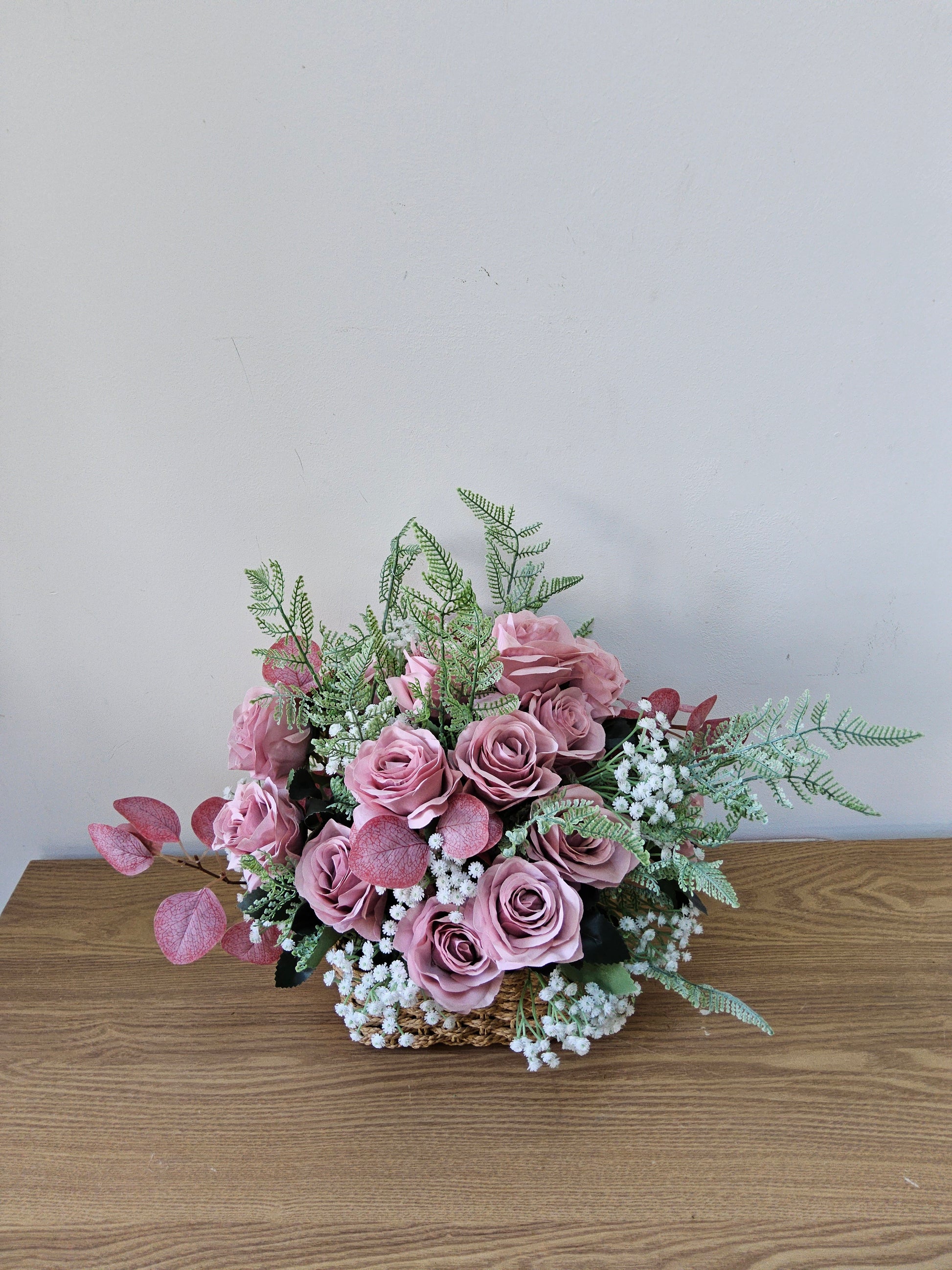 This charming and romantic faux floral arrangement features a beautiful bouquet of dusty rose-colored roses as its centerpiece. The soft, muted pink tones of the roses are complemented by delicate sprigs of white baby's breath, creating a classic and timeless look. The arrangement is enhanced with feathery green ferns and unique foliage that is pink eucalyptus adding texture and a touch of vintage charm. This arrangement would make a lovely statement piece for a table or shelf, bringing a sense of gentle sophistication to any room.