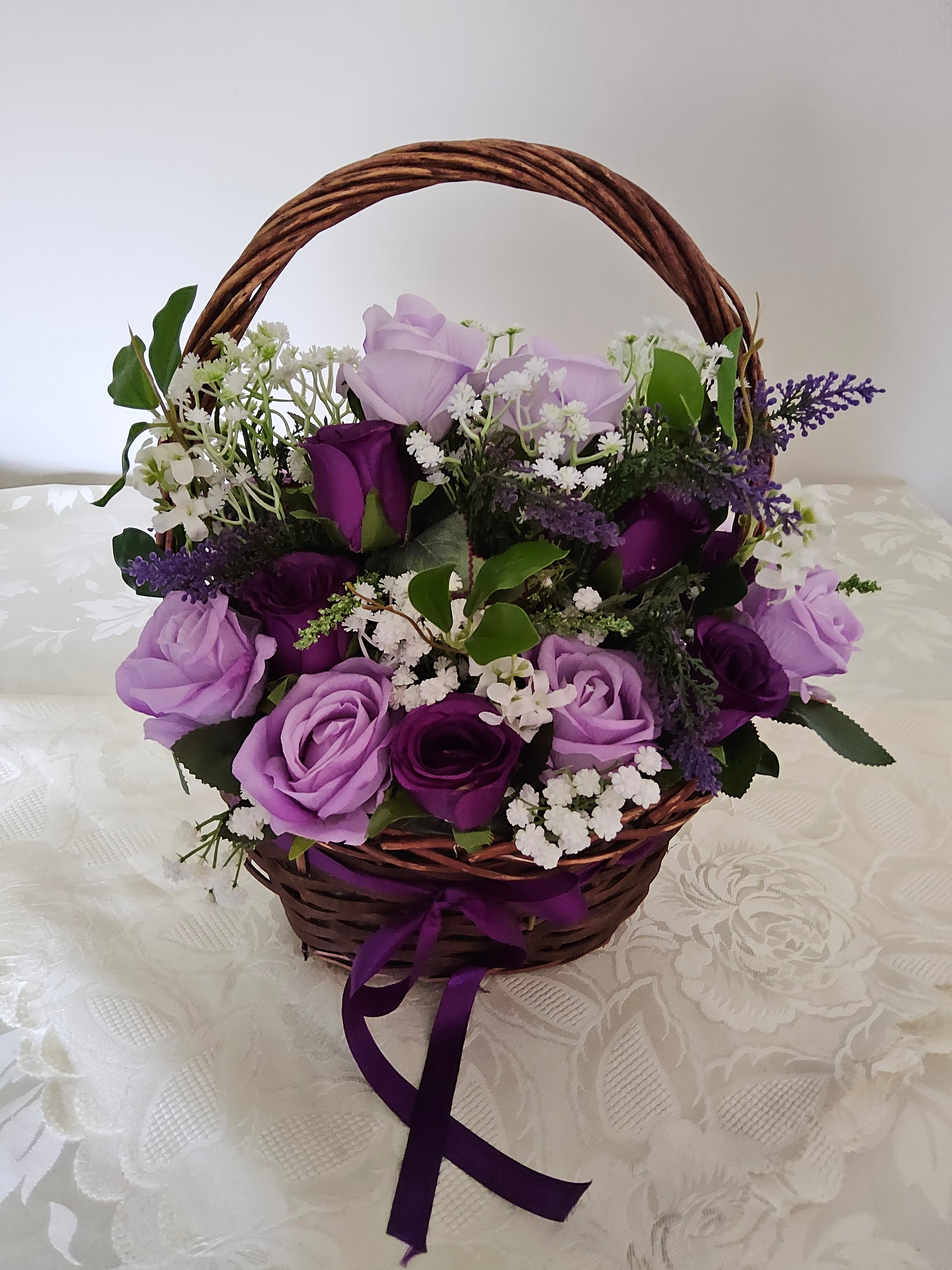 A beautiful brown basket of purple and lilac roses with white blossom and gypsofilla.