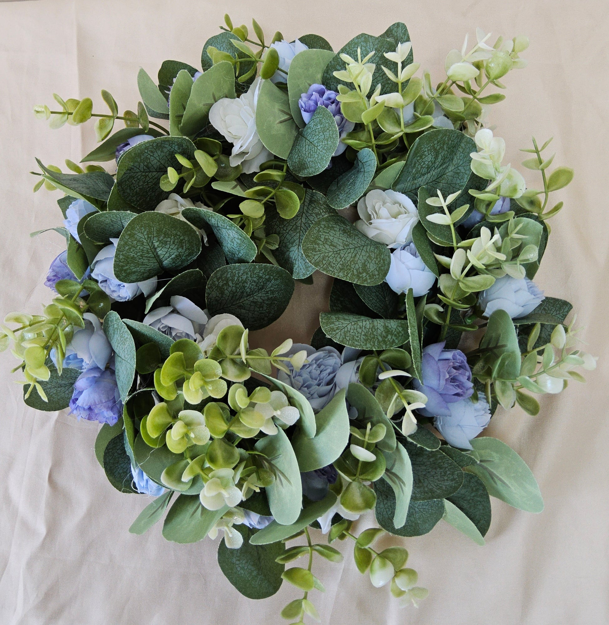 It has a 25cm circumference and has 3 shades of lilac rosebuds and white buds. With eucalyptus leaves.