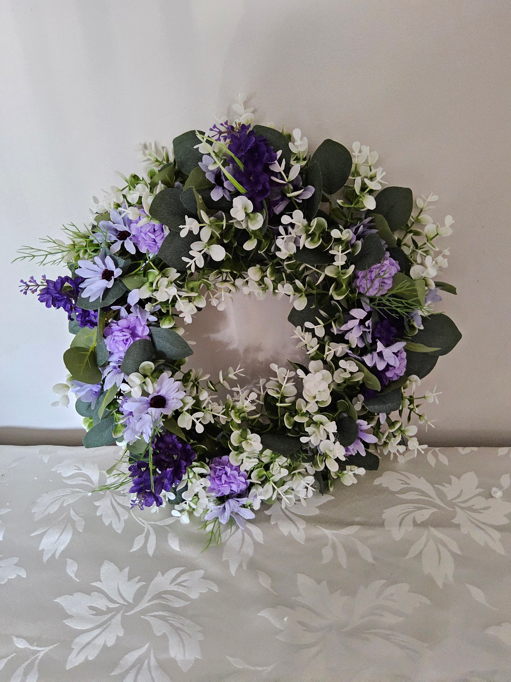 This is a plastic based wreath with eucalyptus and purple flowers all around it. It is stunning and will grace any door.