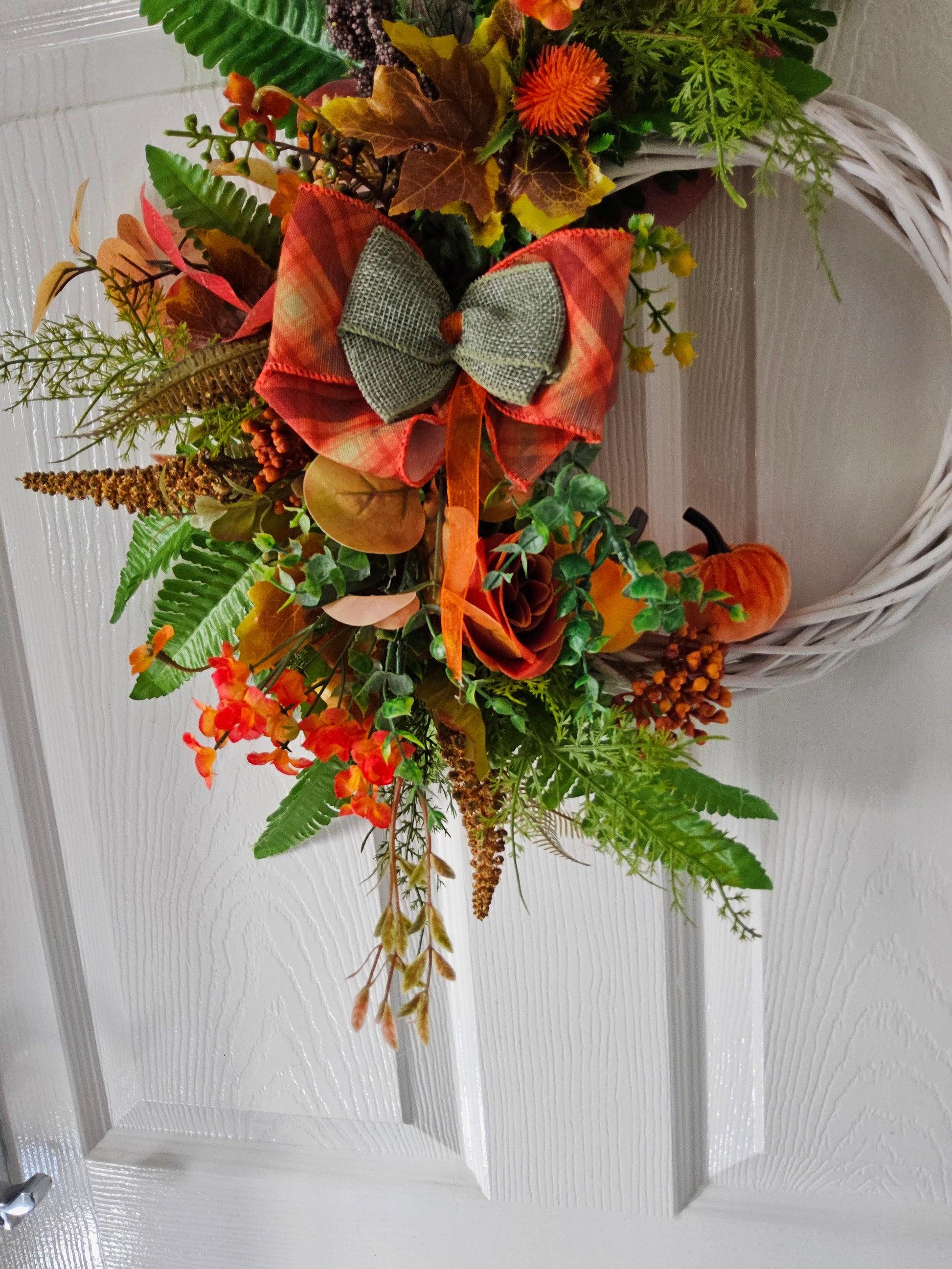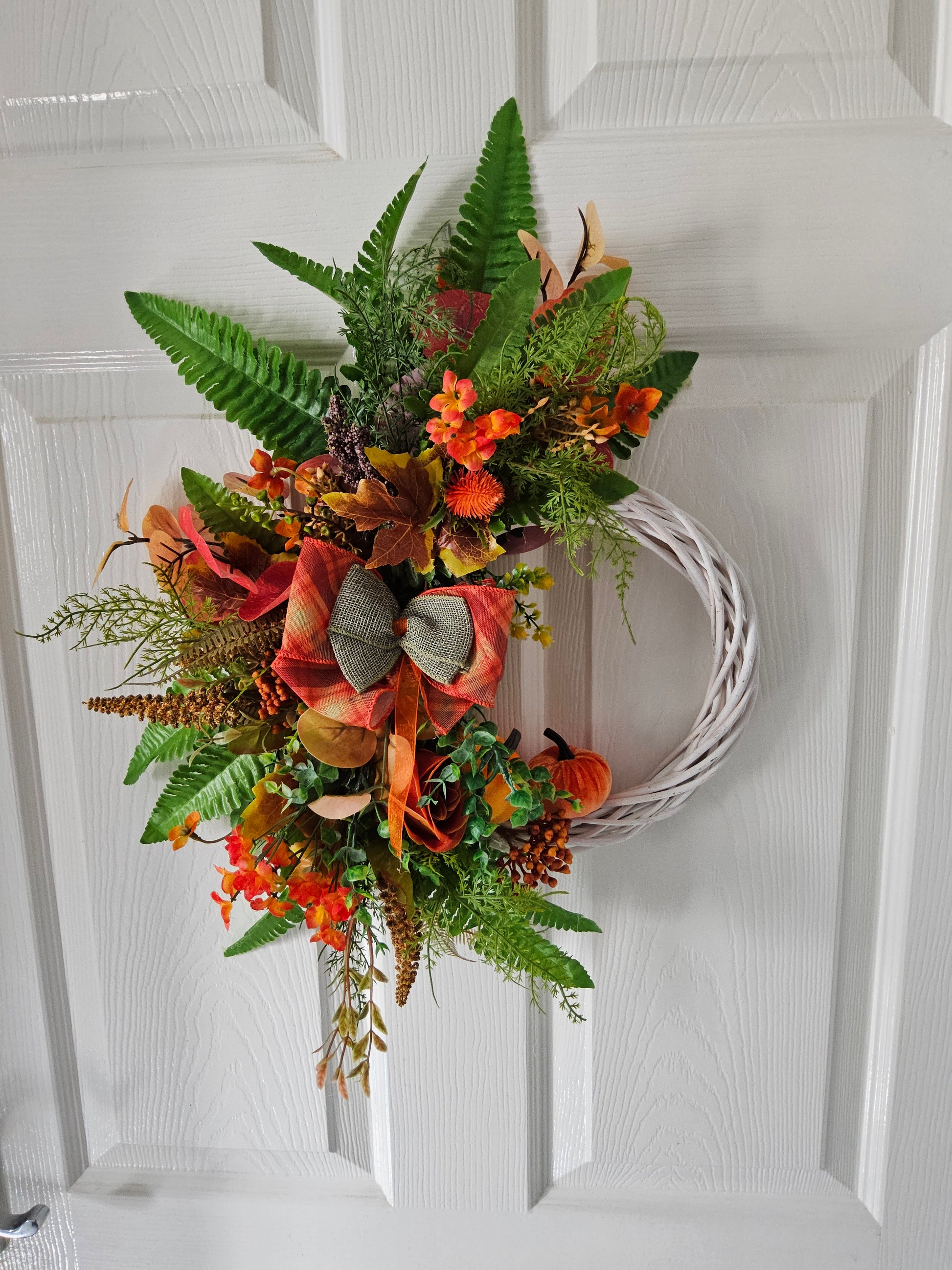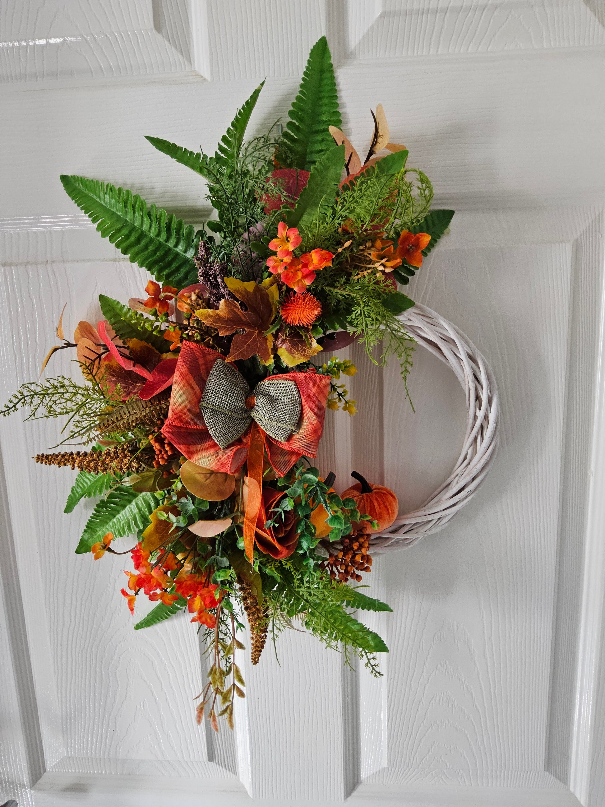 This is a beautifully arranged, handmade autumn wreath. It features a woven white base, half-decorated with a vibrant mix of faux foliage and seasonal elements. The design includes large green fern leaves, various smaller reddish and brown leaves, and clusters of orange and deep red berries. A prominent, textured bow with a plaid pattern in shades of orange, green, and brown serves as a central focal point. The arrangement is accented with small, orange blossoms and a miniature pumpkin, all contributing to a warm, rustic, and festive autumn theme.
