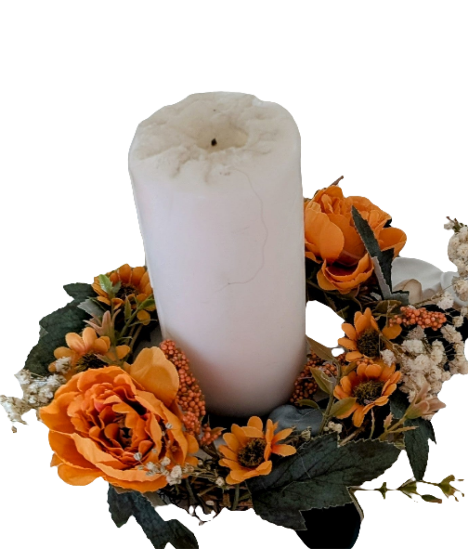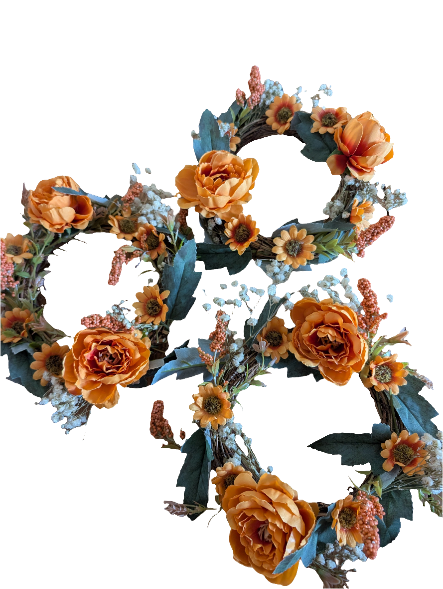 Wreath is made with brown twigs and then decorated with orange flowers.