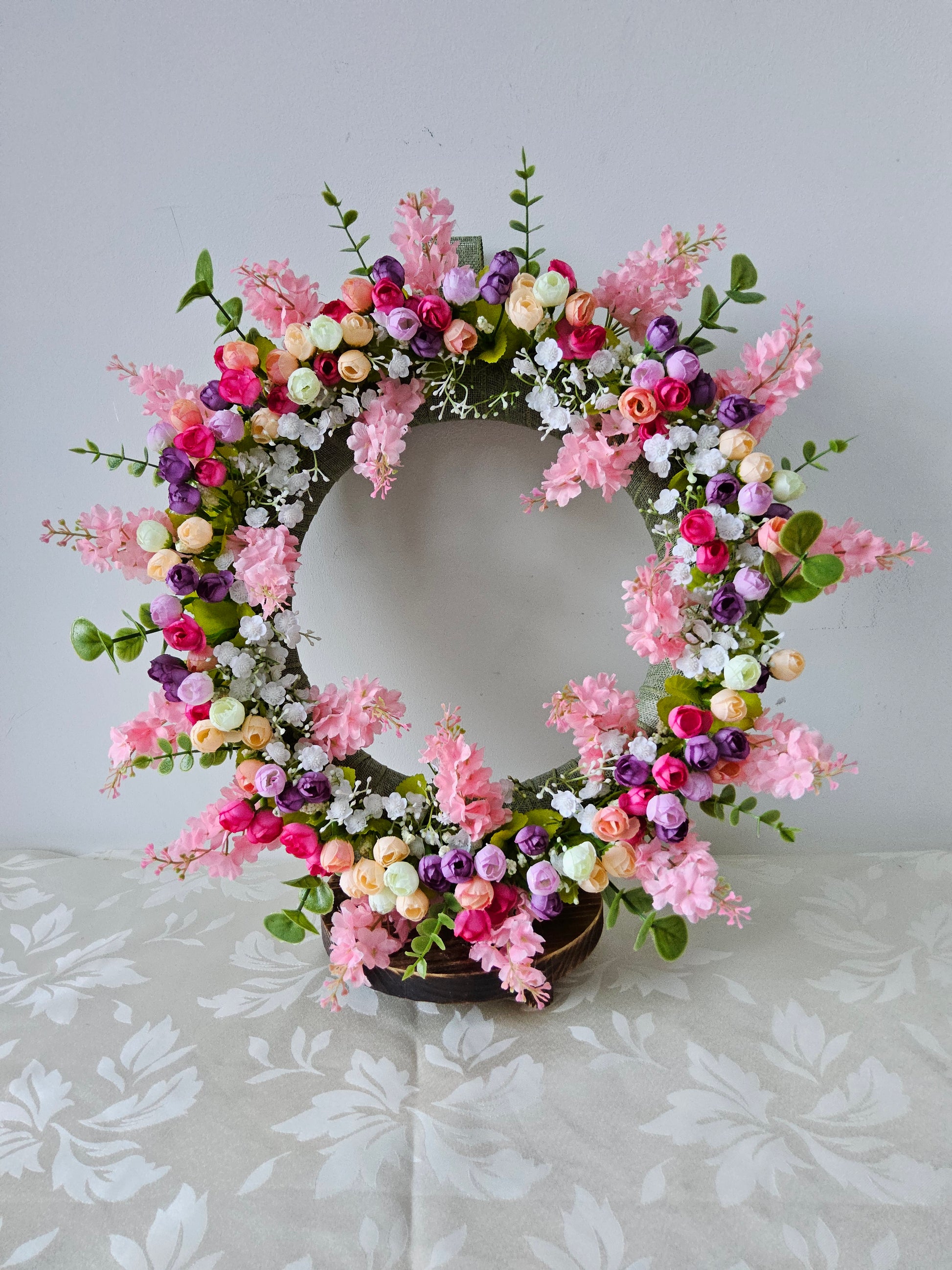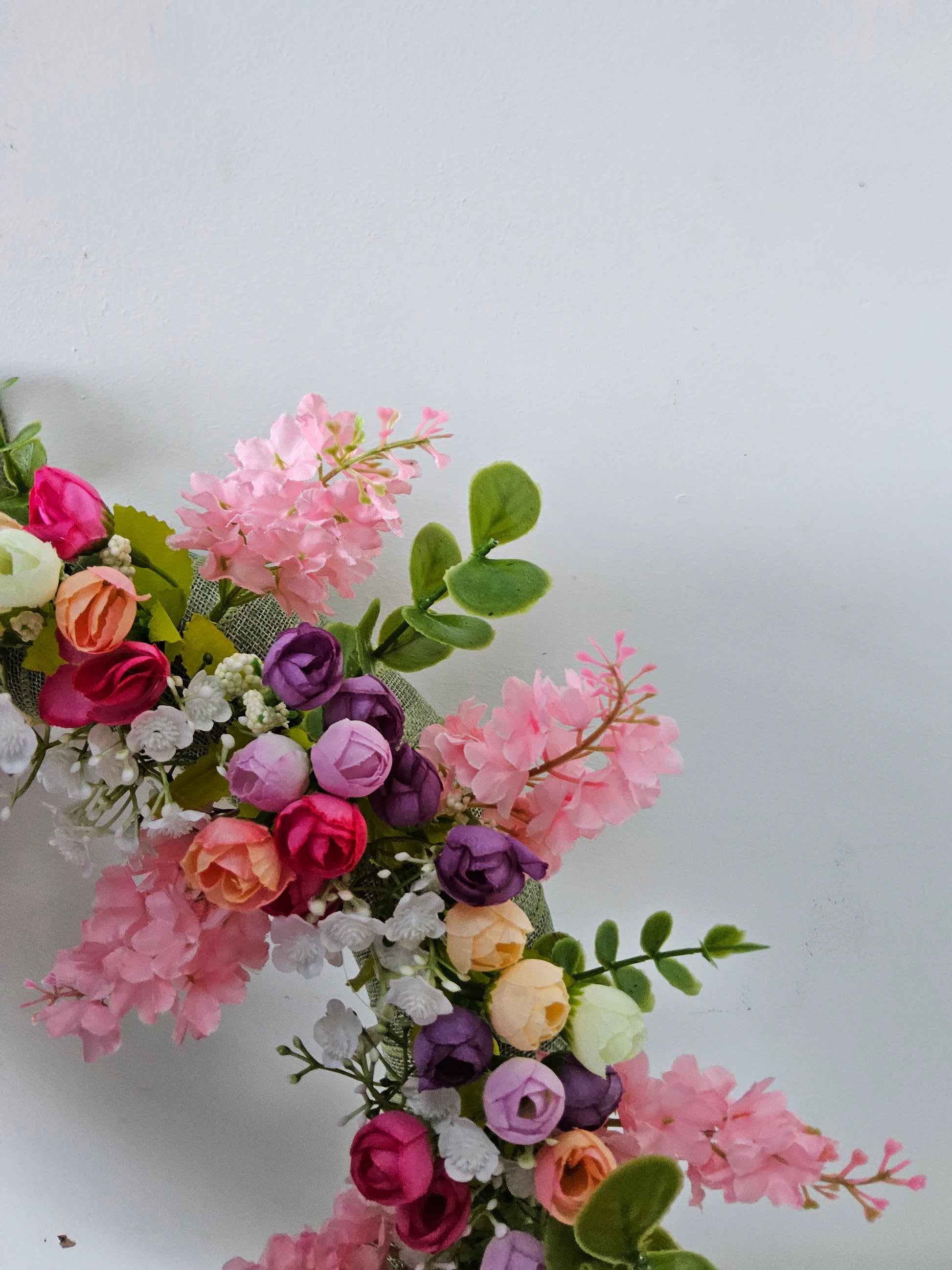 This expertly crafted faux wreath features a harmonious blend of rosebuds in white, light pink, dark pink, and lilac, complemented by delicate pink hyacinths and white gypsophila. Arranged on a sturdy styrofoam ring wrapped in green hessian, it offers a lifelike and elegant floral display perfect for enhancing any interior with a touch of summer meadow charm. Durable and maintenance-free, it provides lasting beauty year-round.