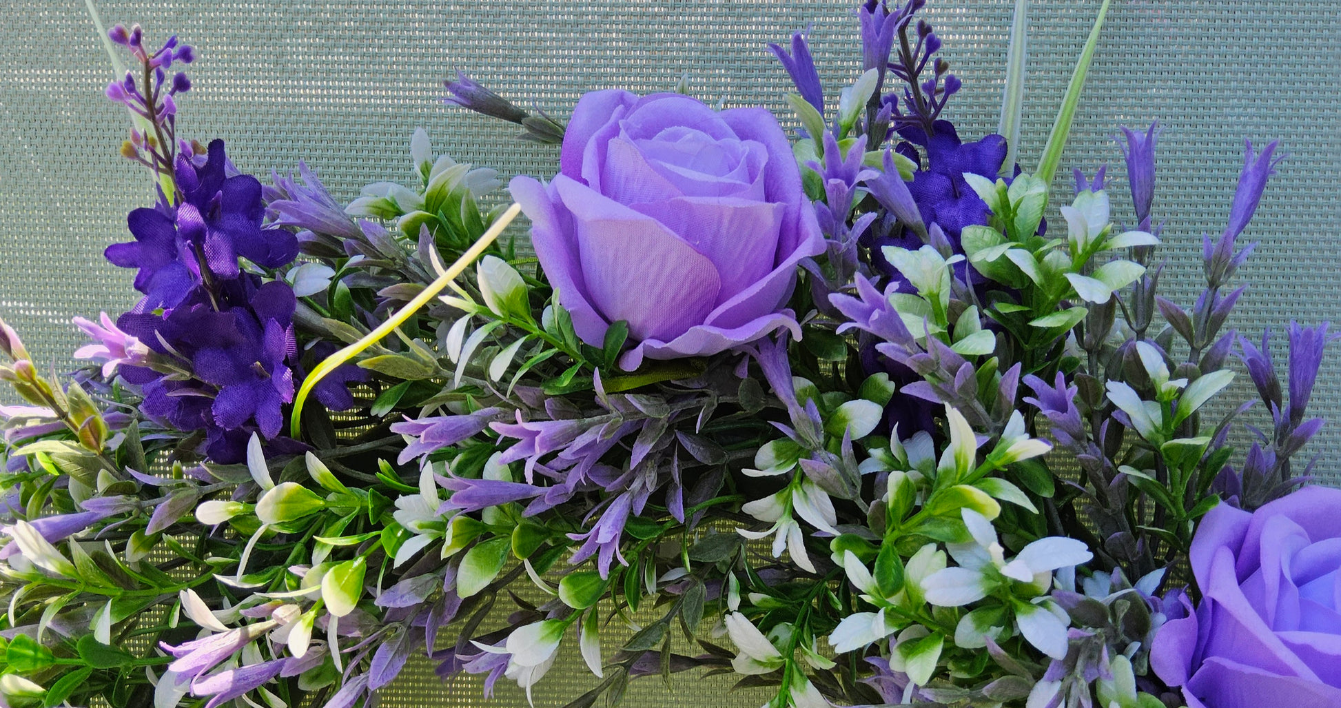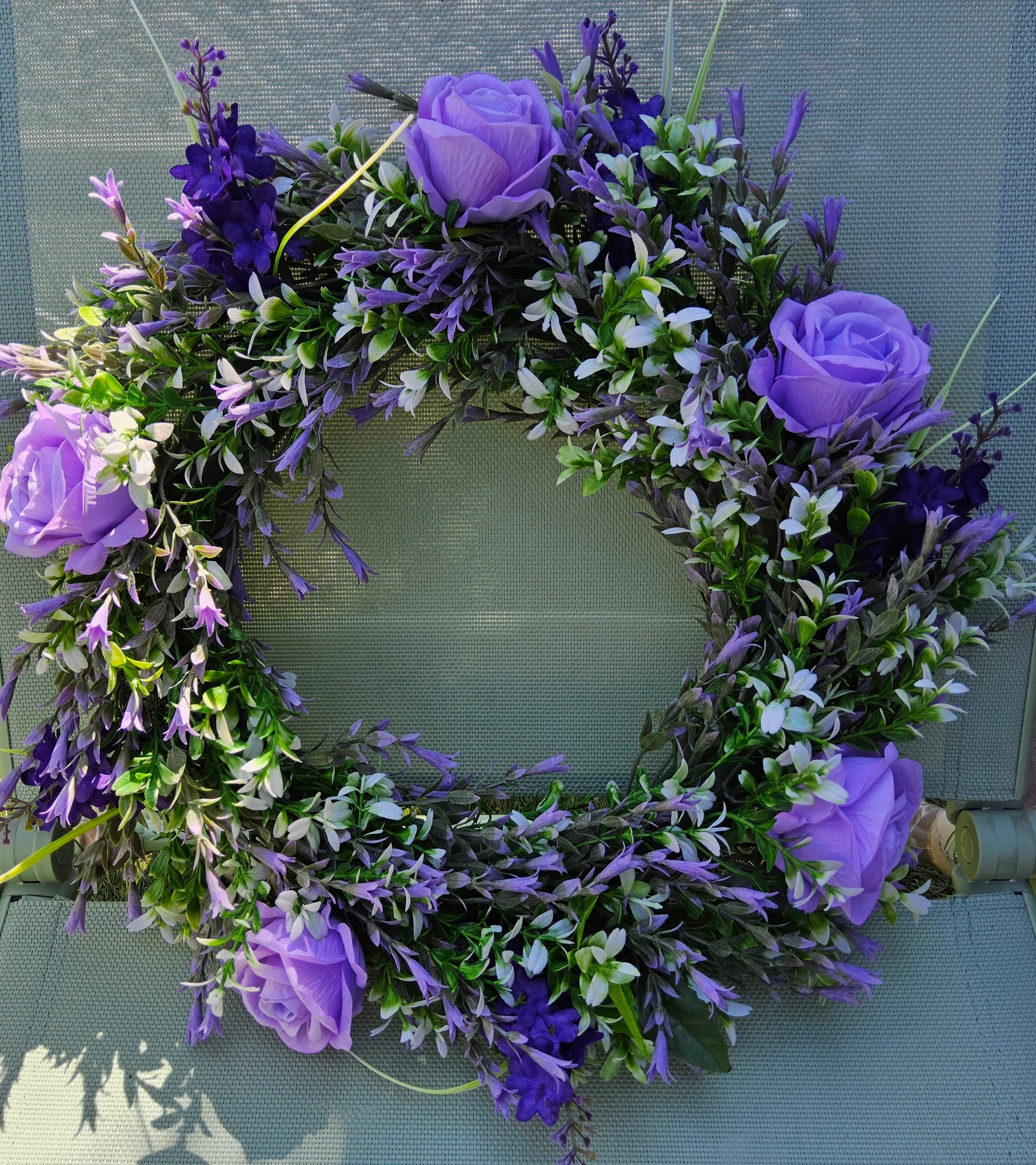 Summer wreath with purple hyacinths, lilac roses and lavender.
