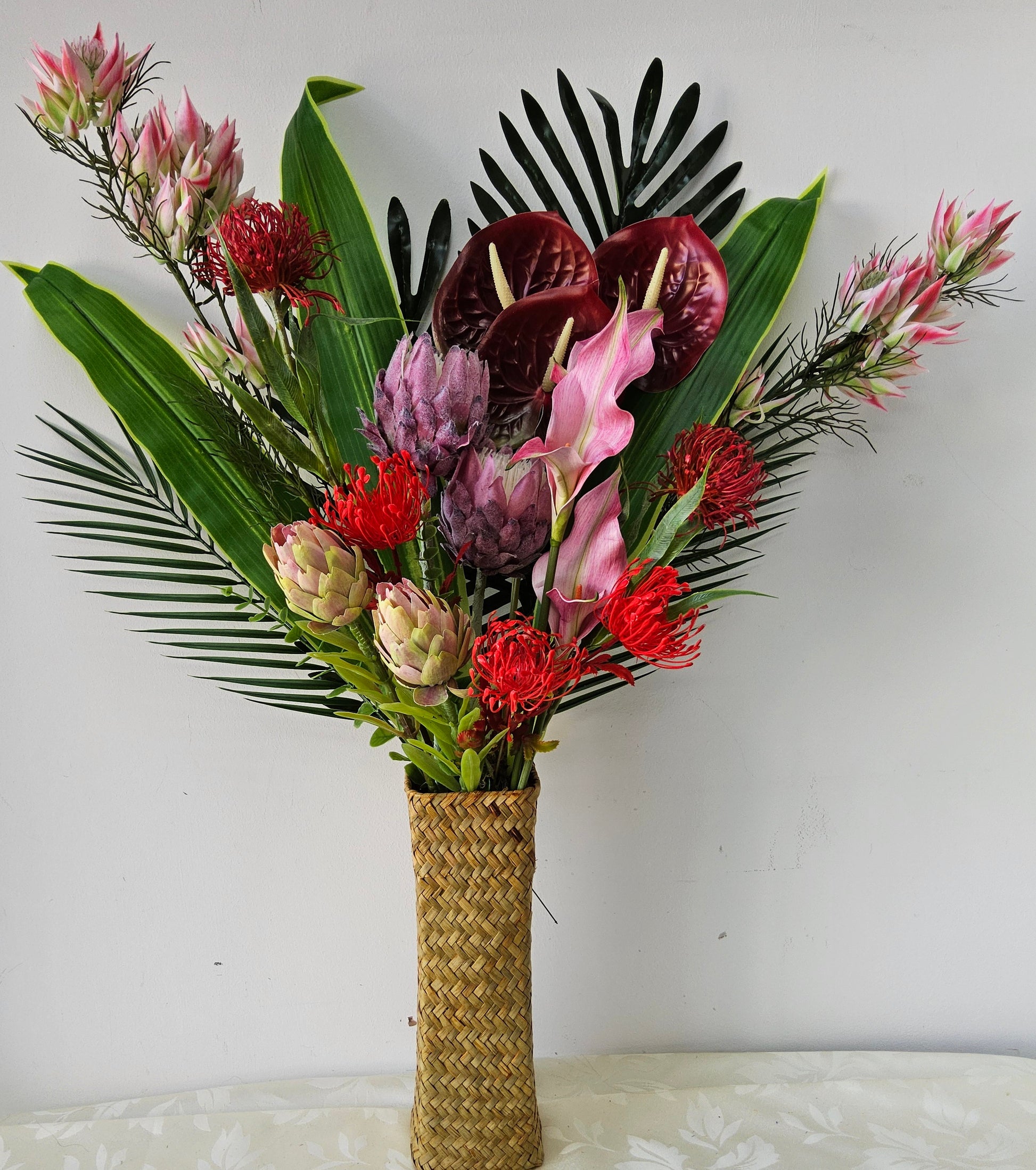 The Tropical Grandeur faux floral arrangement combines elegant anthurium, protea, ginger, palm leaves, and broadleaf tropical foliage, all beautifully presented in a woven tall basket. This sophisticated design brings a touch of exotic charm and lasting natural beauty to any space, perfect for those seeking refined, maintenance-free décor.