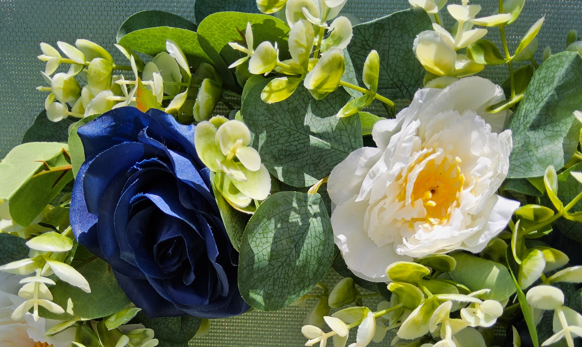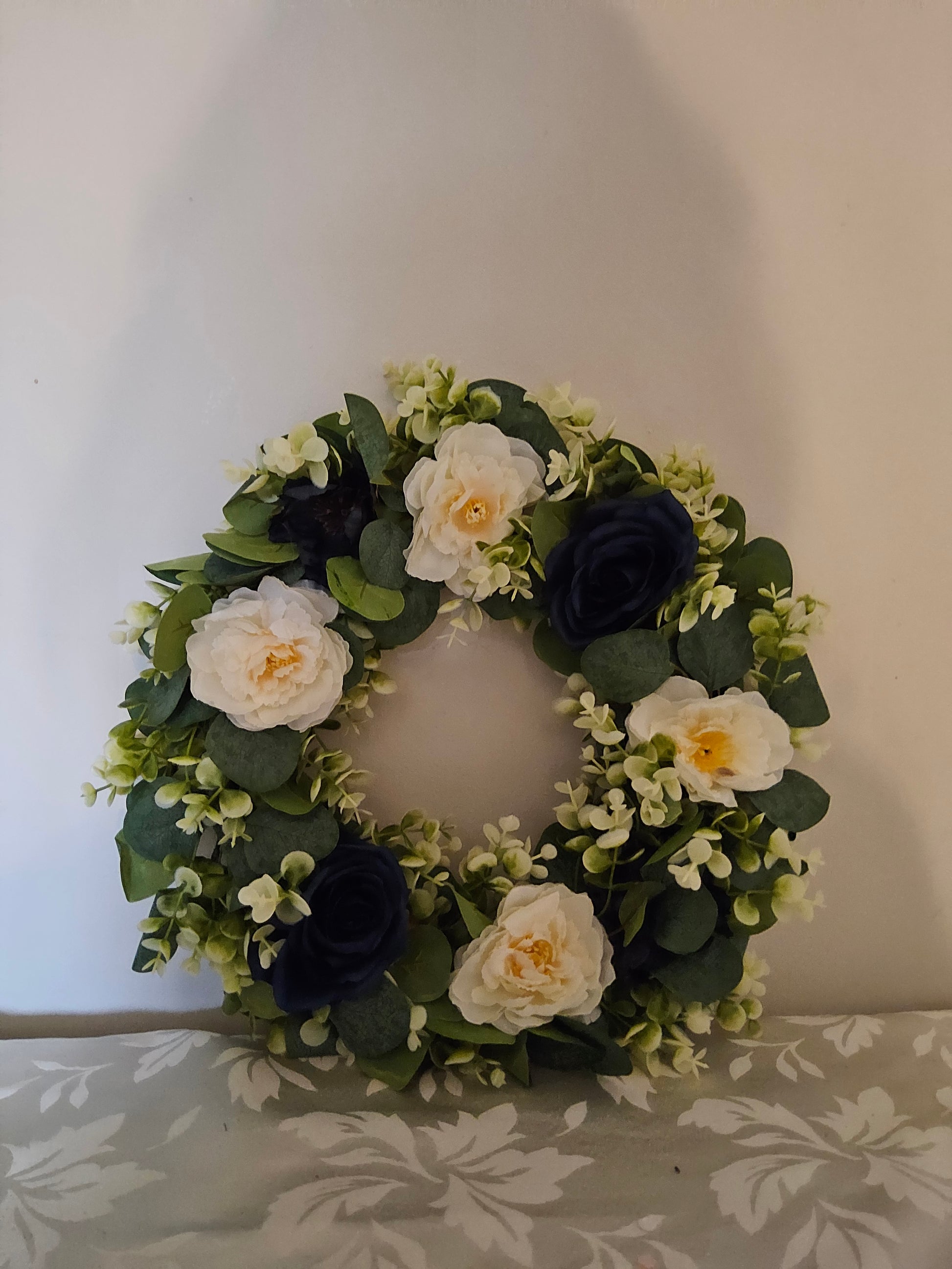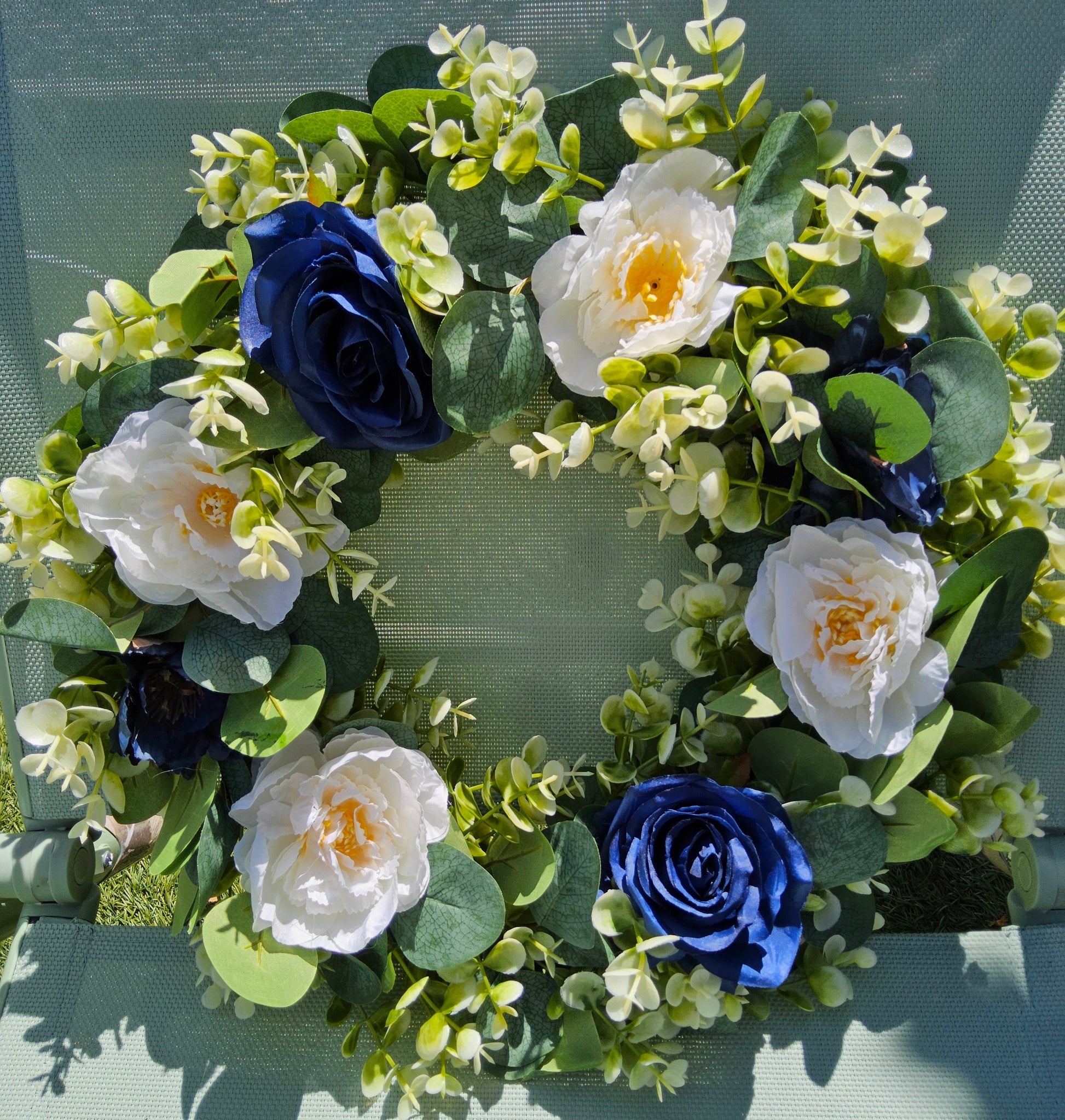 Beautiful navy and ivory rose wreath with a eucalyptus plastic base. Add a touch of elegance and a welcoming feel to your home.